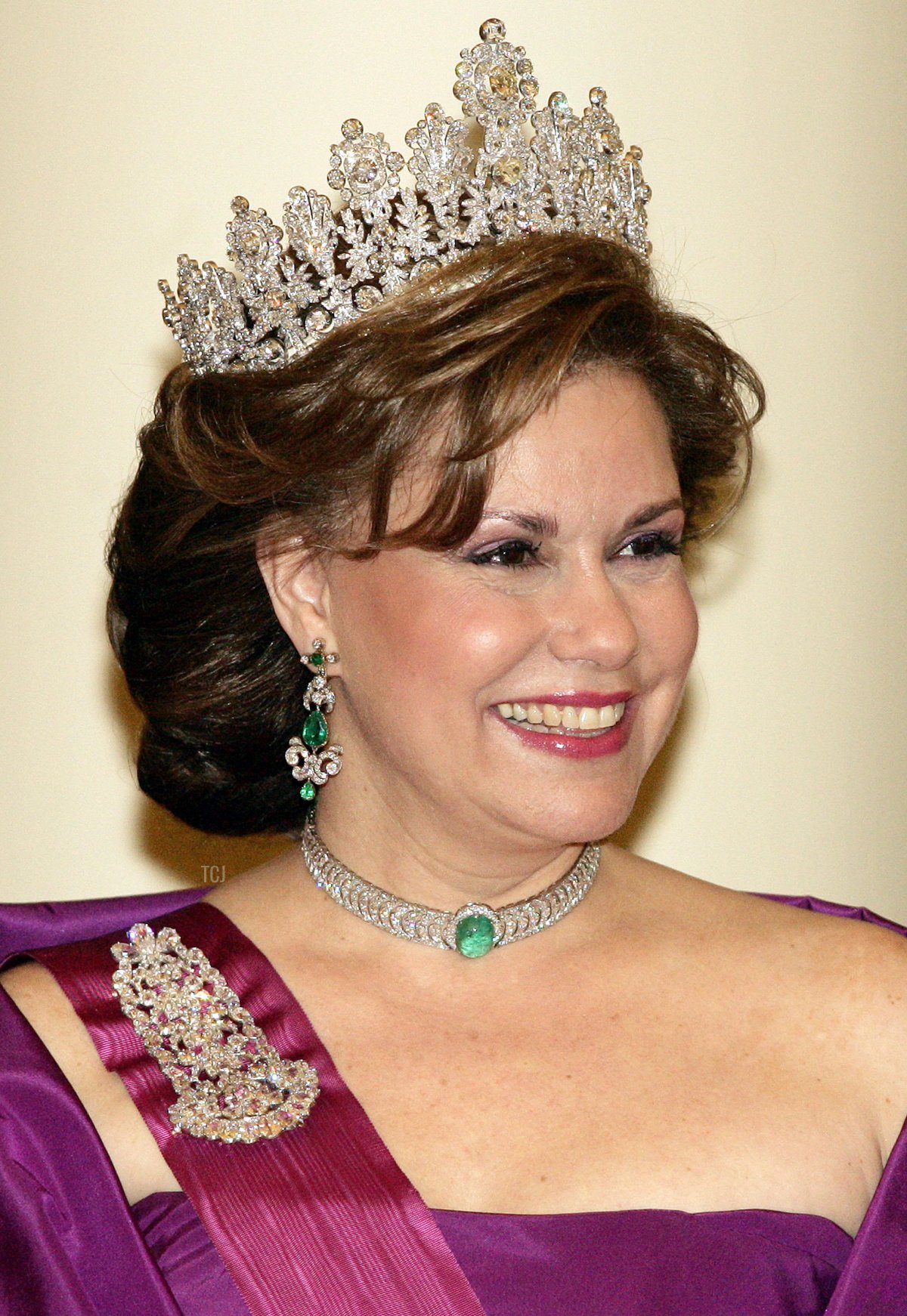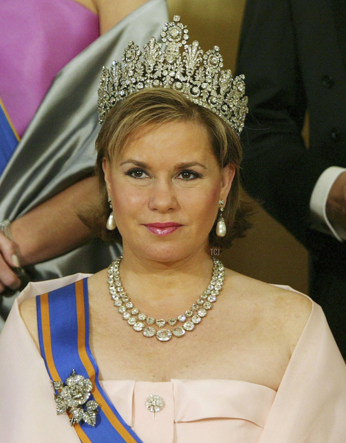 The family’s collection also includes a trio of naturalistic diamond rose brooches, which date to at least the 1850s. The women of the family generally wear the brooches one at a time, often to secure the sash of a chivalric order. In the photograph above, taken in the Netherlands in 2006, Maria Teresa wears one of the brooches pinned to the sash of the Order of the Netherlands Lion. She’s also wearing the Empire Tiara, both diamond rivières, and the family’s classic pearl drop earrings.