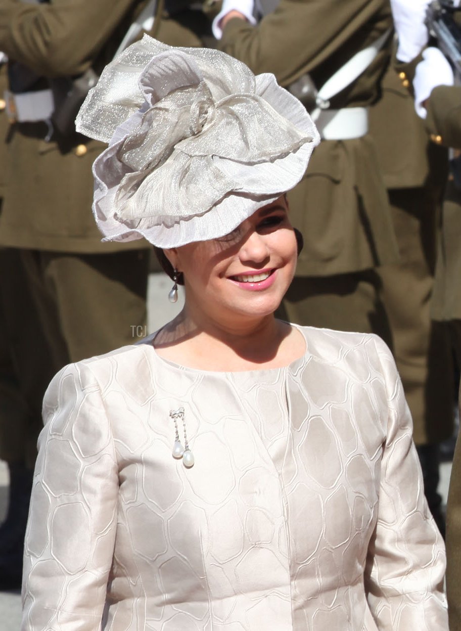 One of the most delicate pieces in the family collection is this diamond and pearl négligée, which can be worn either as a brooch or a pendant. (In jewelry terms, a “négligée” is an ornament with two pendant sections, one of which is slightly longer, producing an asymmetrical effect.) The first owner of the piece was Infanta Maria Ana of Portugal, the wife of Grand Duke Guillaume IV of Luxembourg. It’s now worn by Grand Duchess Maria Teresa. In the photograph above, she wears it as a brooch on National Day in 2010.