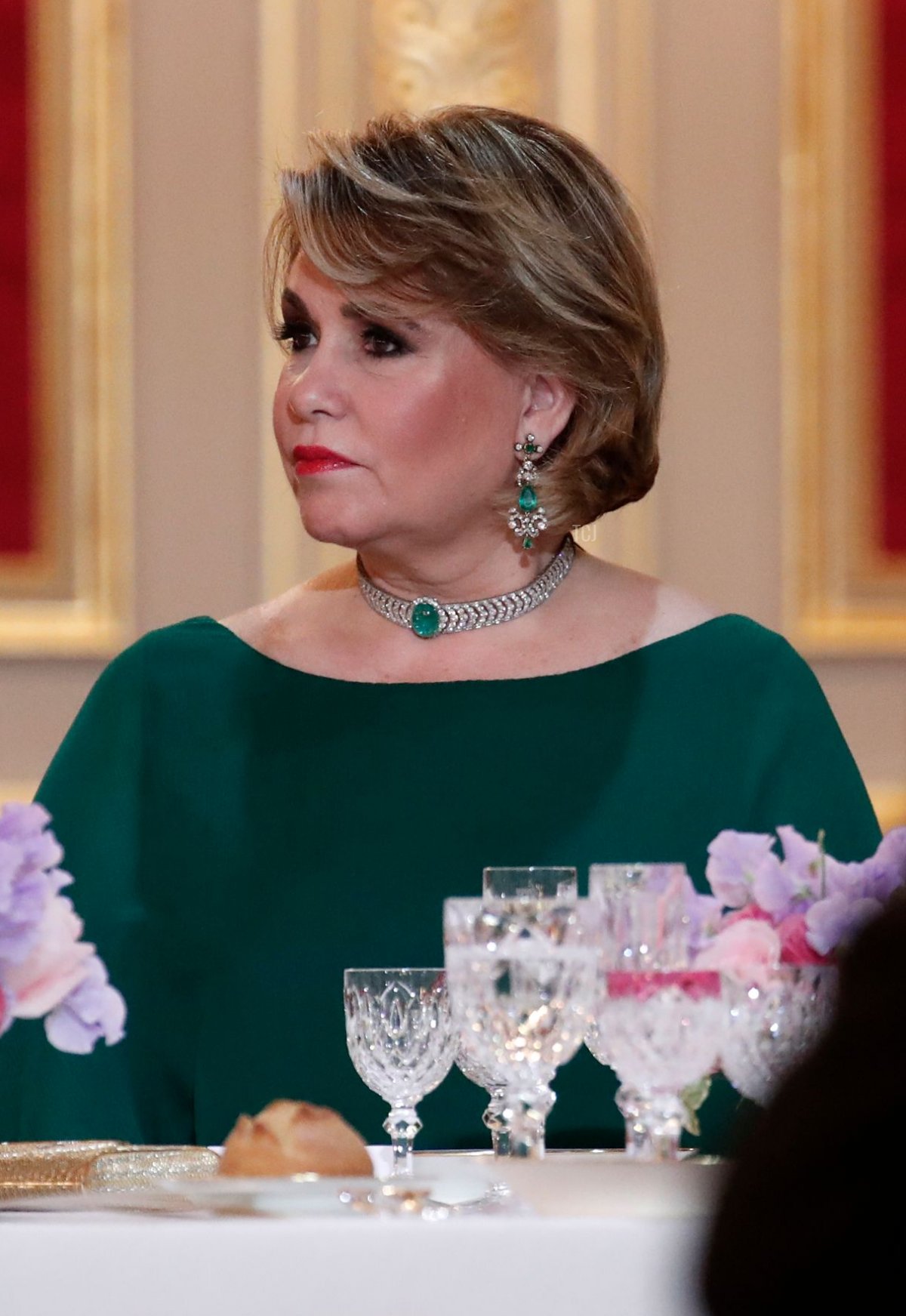 The current ruler of Luxembourg, Grand Duke Henri, is the grandson of King Leopold III and Queen Astrid of Belgium, so it should come as no surprise that there are several pieces of Belgian royal jewelry in the grand ducal vaults. One of the most impressive is this diamond and emerald jewel, which features a single emerald cabochon. The piece can be worn as both a choker necklace and as a bracelet. The necklace has become a favorite of Grand Duchess Maria Teresa, who wears it above during a visit to France in 2018. She often pairs them with these diamond and emerald earrings.