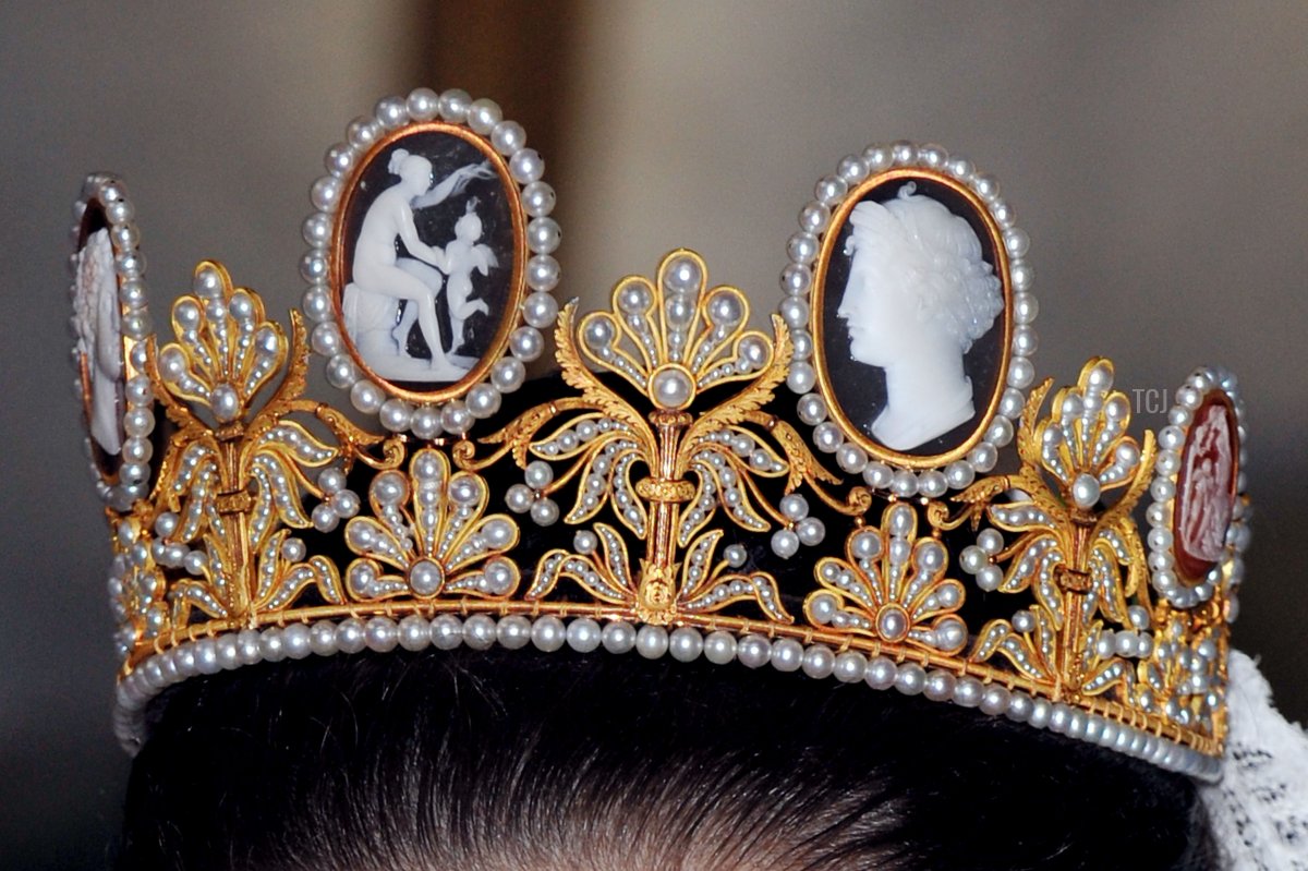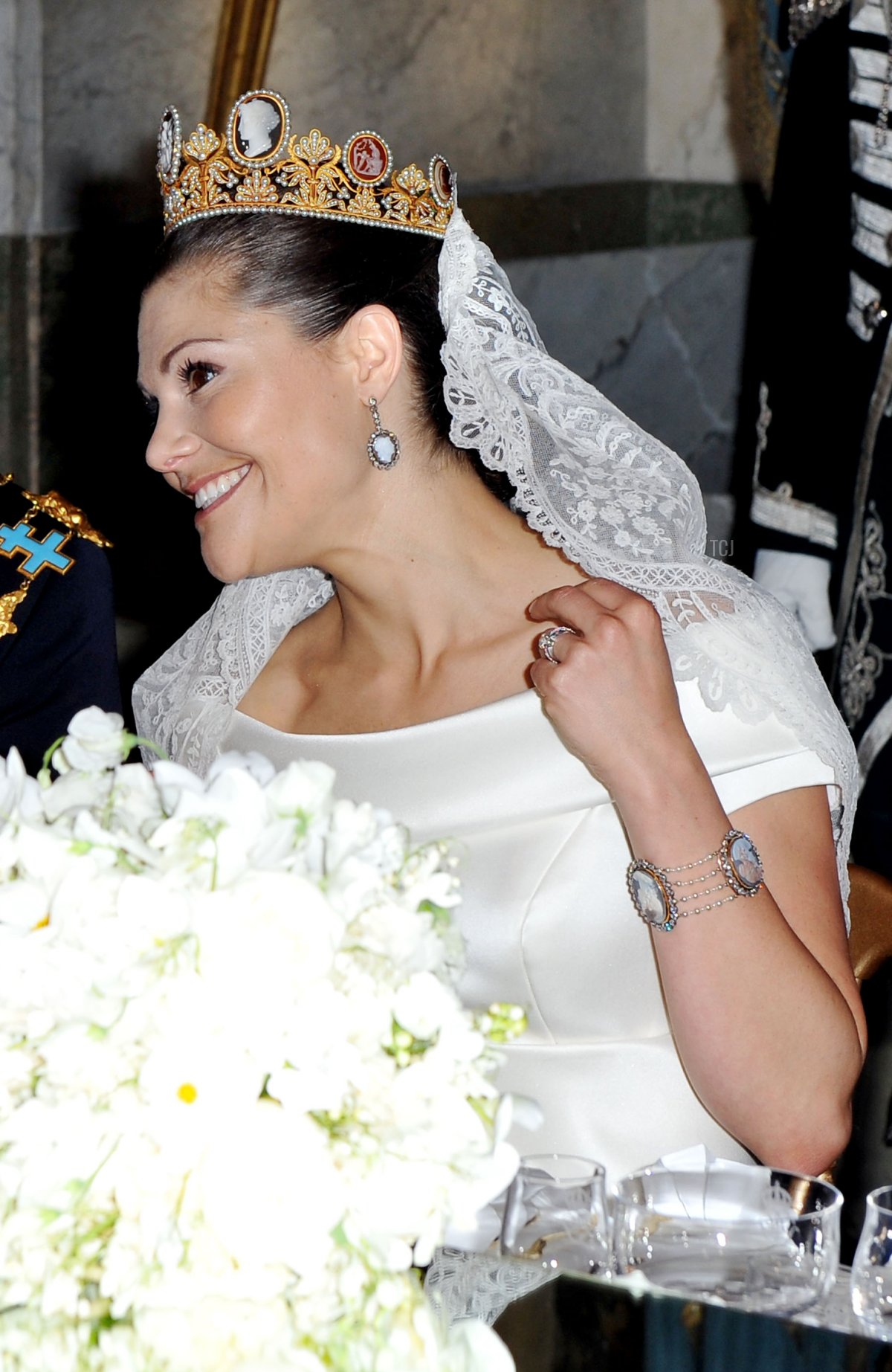 Victoria secured the veil with a unique tiara that has also been worn by several Swedish royal brides. The Cameo Tiara, made of gold and pearls, features hand-carved cameos that date to the Napoleonic era. Indeed, the tiara originally belonged to Napoleon’s first wife, Empress Josephine, and he commissioned the cameos himself. In a recent documentary about Sweden’s royal jewels, Crown Princess Victoria admitted that she has “a little extra respect” for this particular tiara, given its age, its apparently fragile state, and its use at important occasions.