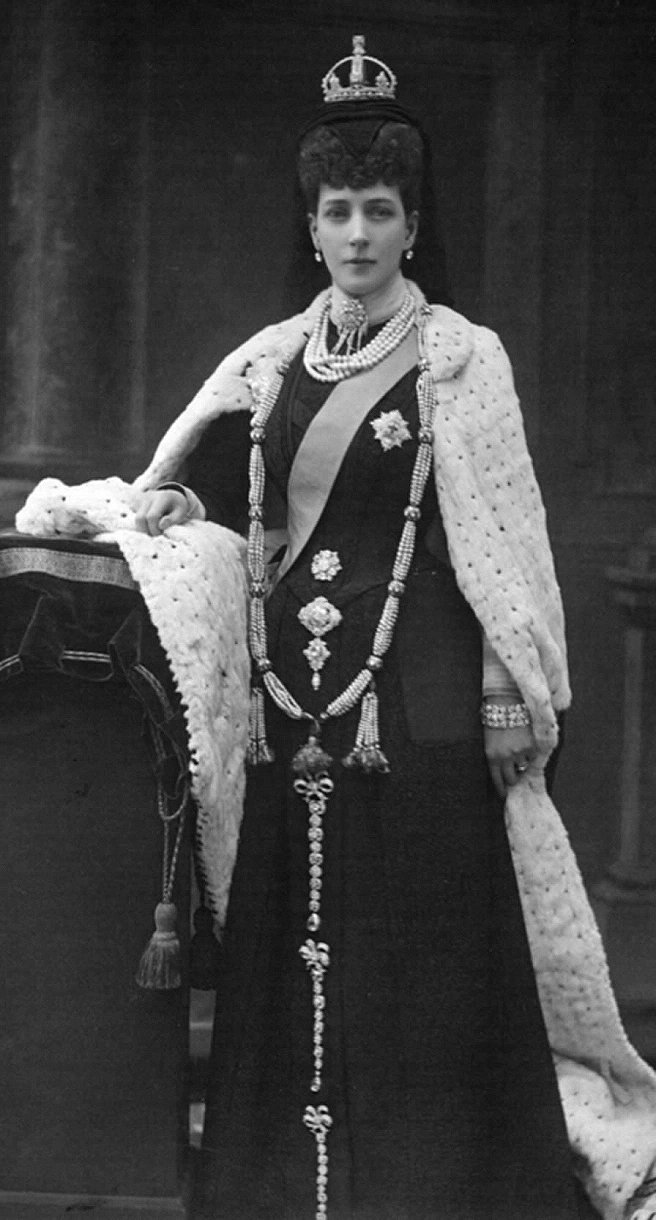 Adelaide passed down the brooch to her niece, Queen Victoria, who designated the piece as an heirloom of the crown. This means that it’s earmarked to stay with the main line of the monarchy, so that it can be worn by British queens, both regnant and consort. It’s been worn by every woman who has held the title since. Above, in February 1901, Queen Alexandra wears the brooch at her waist for the first State Opening of Parliament of her husband’s reign. (More views from the event here.) You’ll also recognize several other pieces of familiar royal jewelry, including Queen Victoria’s Fringe Brooch at Alexandra’s throat and Queen Victoria’s Diamond Bow Brooches cascading down her skirt. She’s also wearing Queen Victoria’s Diamond Bracelet, as well as her small diamond crown.