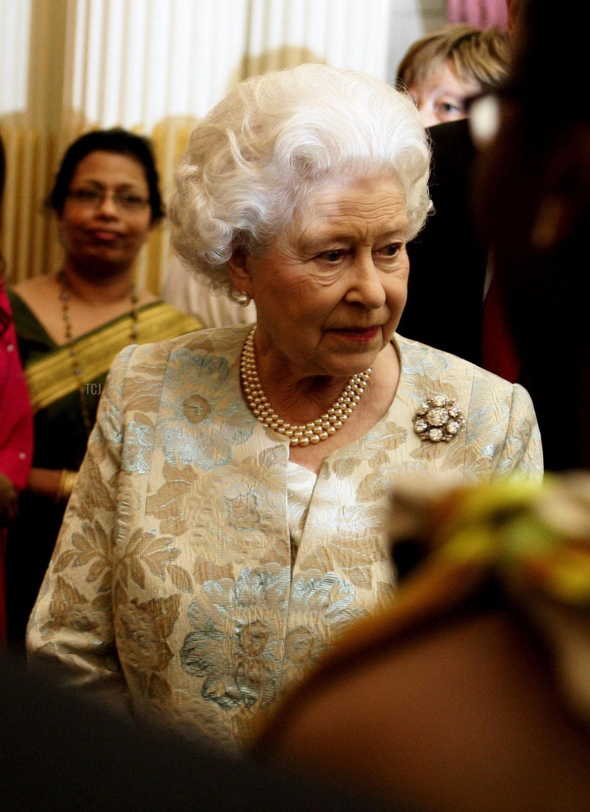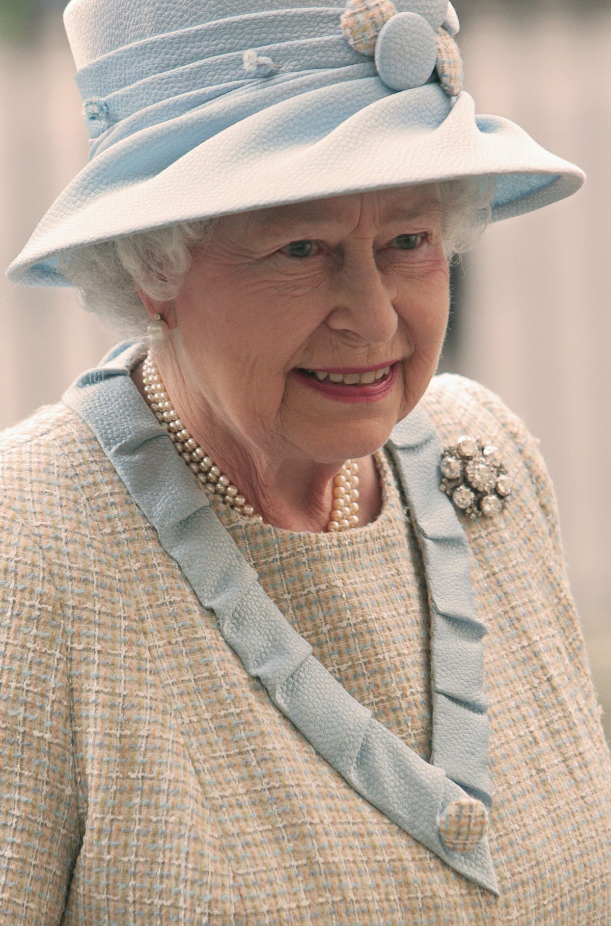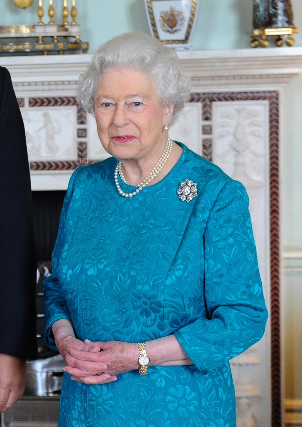 The brooch isn’t one of the Queen’s most-worn jewels, but you will see it pop up occasionally, especially for important daytime and evening events. In November 1999, she wore it for the gala dinner held during the Commonwealth Heads of Government Meeting. (The event was held in South Africa, and she’s walking here with President Thabo Mbeki.) She wore the brooch pinned to her Garter sash, pairing it with the pearl setting of the Vladimir Tiara, plus a suite of pearls given to her in 1979 by the Emir of Qatar.