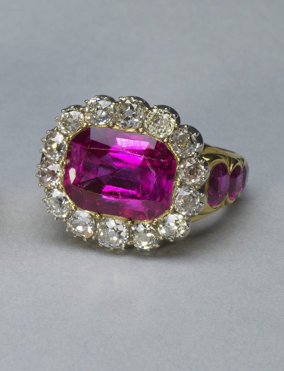 There’s a third jewel that was also included in that collection of coronation rings, passed down from Queen Adelaide and now residing in the Tower of London. A separate coronation ring was usually made for the queen consort. Adelaide’s ring, usually just called the Queen Consort’s Coronation Ring, was also made in 1831. It featured a bright pinkish-red ruby set in a cluster of diamonds, with additional rubies set in the ring’s gold band.