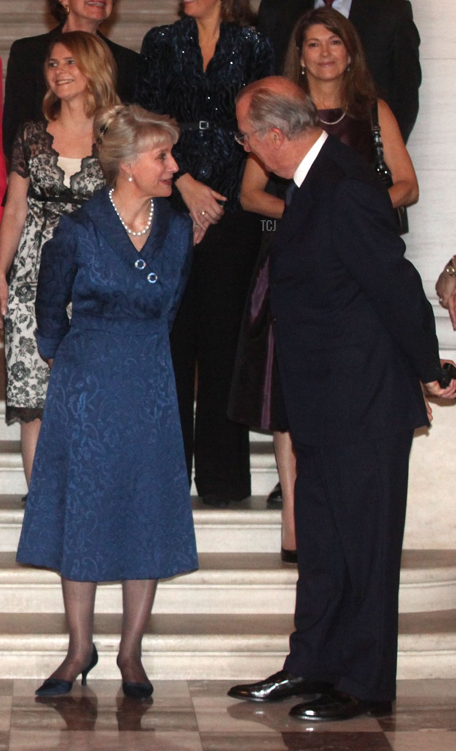 The Duchess wears these brooches often for a range of engagements and occasions. Today, we’re going to focus on one specific appearance: a concert at Laeken Castle, one of the residences of the Belgian royal family, near Brussels on November 16, 2010. Above, Birgitte chats with King Albert II of Belgium during the event.