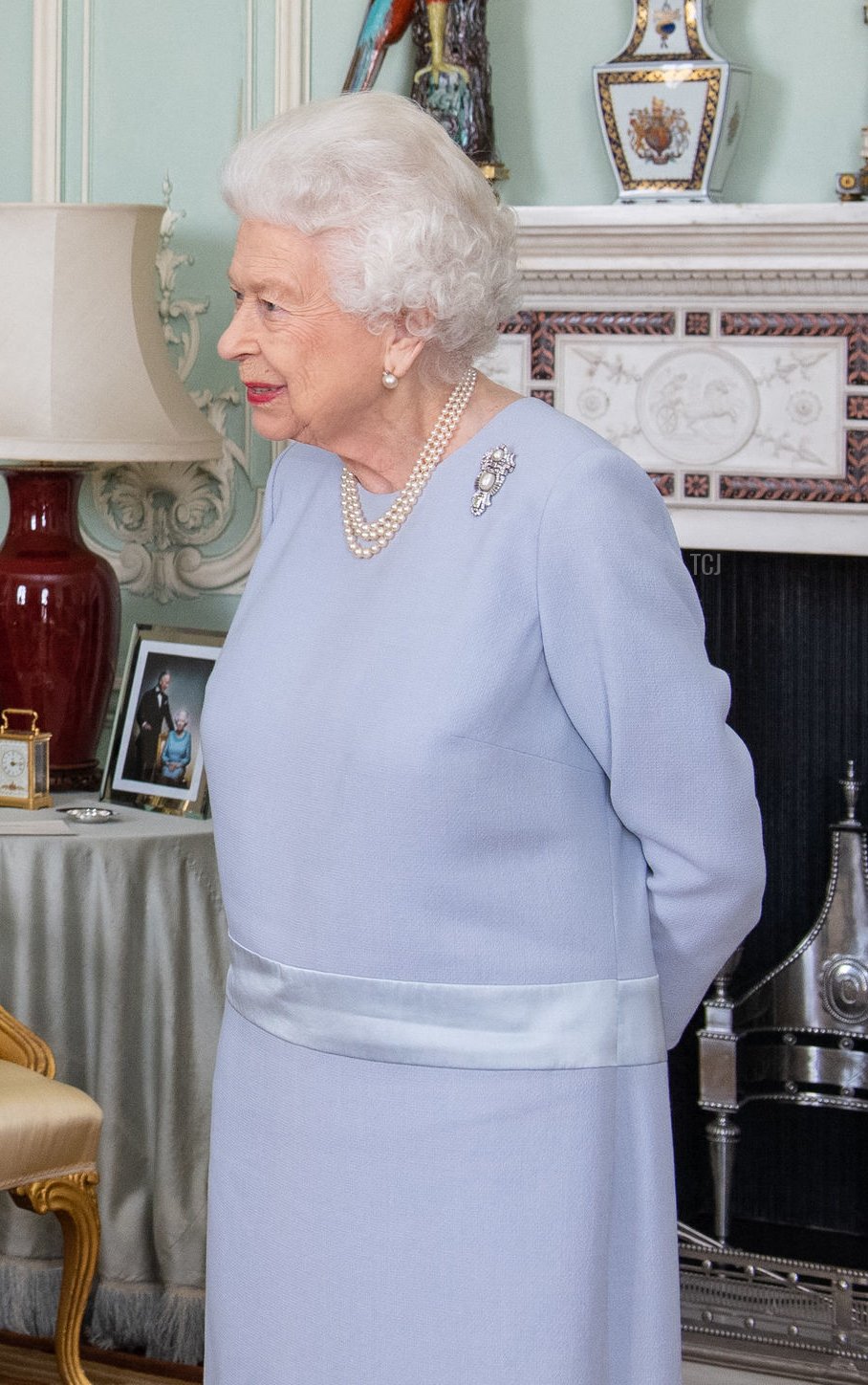 For the audience, the Queen wore a pale blue dress with classic pearls, including a pearl and diamond brooch.