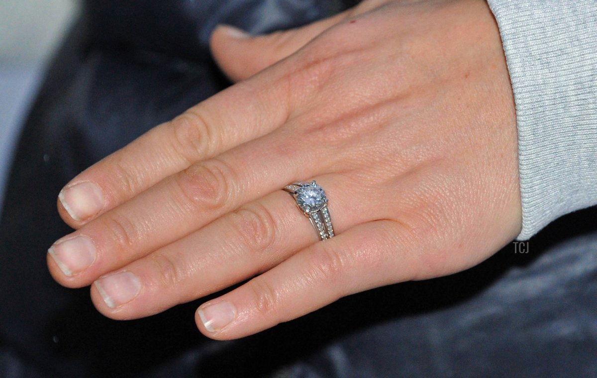 Zara’s ring features a large central diamond. The platinum ring’s band, a double-row design, features pavĂ©-set diamonds.