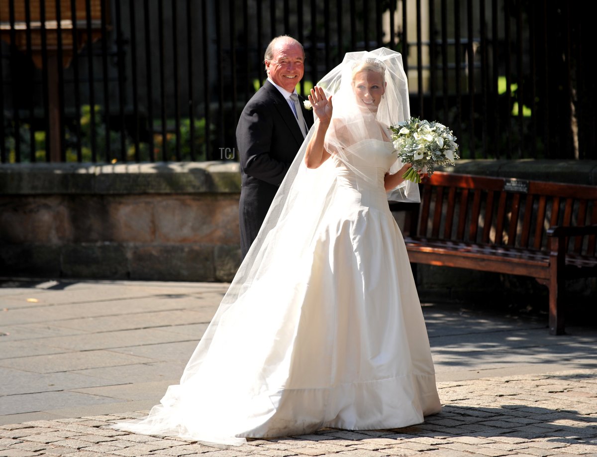 On July 30, 2011, Zara arrived at Canongate Kirk in Edinburgh on the arm of her father, Mark Phillips, for the wedding ceremony. She wore a silk gown by British designer Stewart Parvin, who has often made clothes for her grandmother, the Queen.
