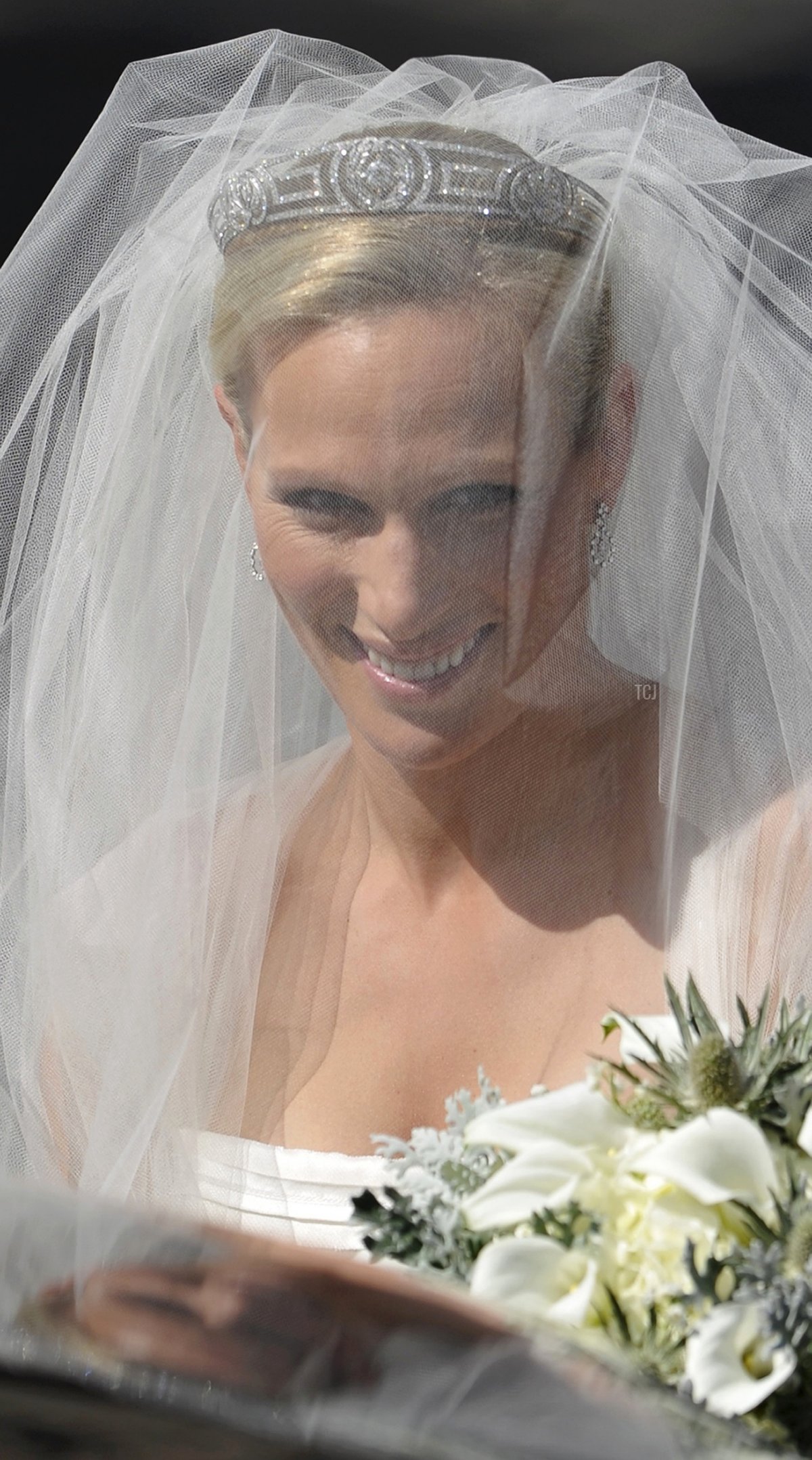 Underneath her tulle veil, Zara wore two pieces of diamond jewelry with important royal connections.