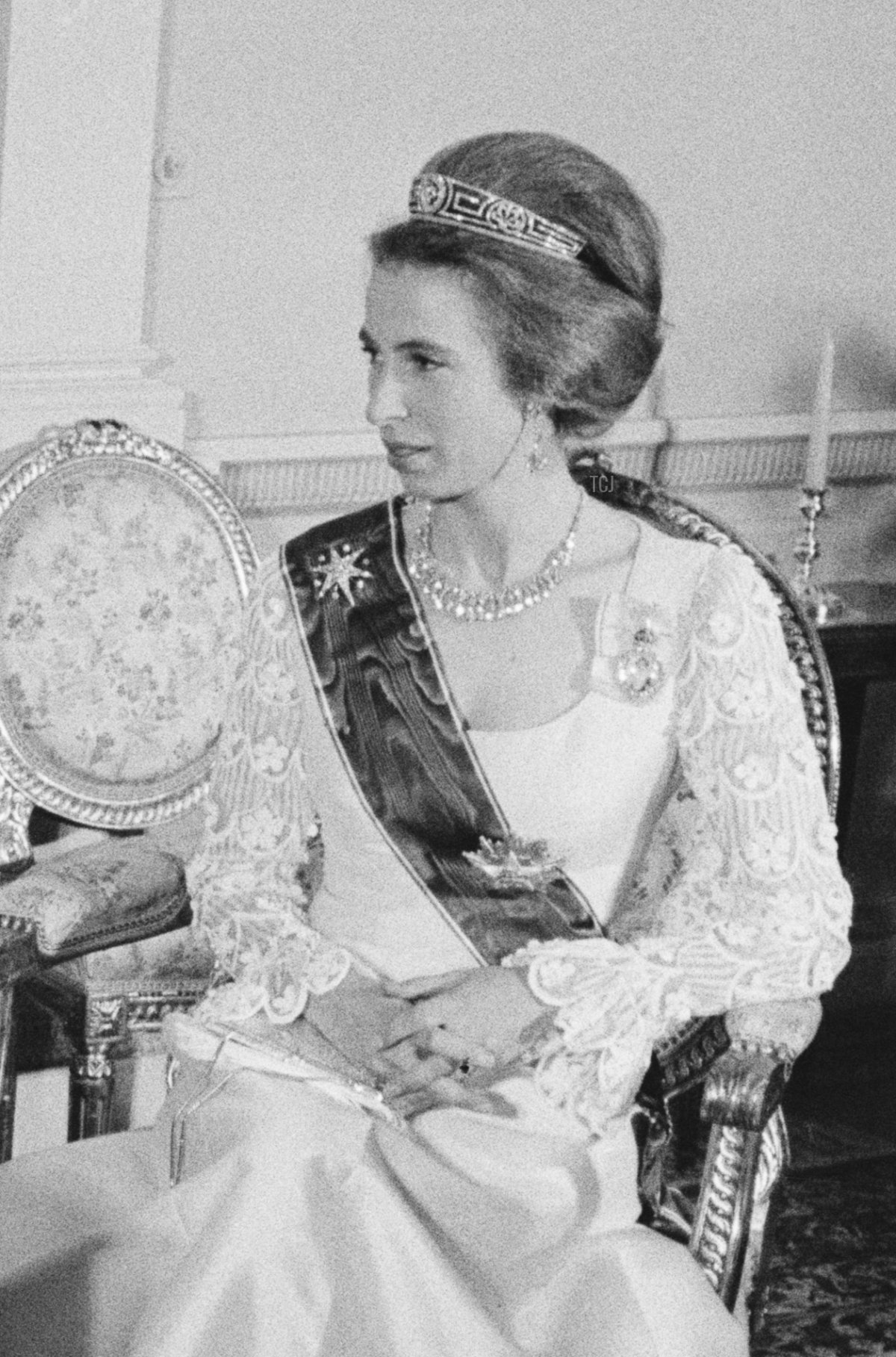 When Prince Philip married Princess Elizabeth of the United Kingdom (the present Queen) in 1947, Alice gave the meander tiara to her new daughter-in-law as a wedding present. In turn, Elizabeth gifted the tiara to her daughter, the Princess Royal. Anne has worn the tiara for more than half a century. In the photograph above, she wears it during a royal banquet in Belgrade in October 1972.