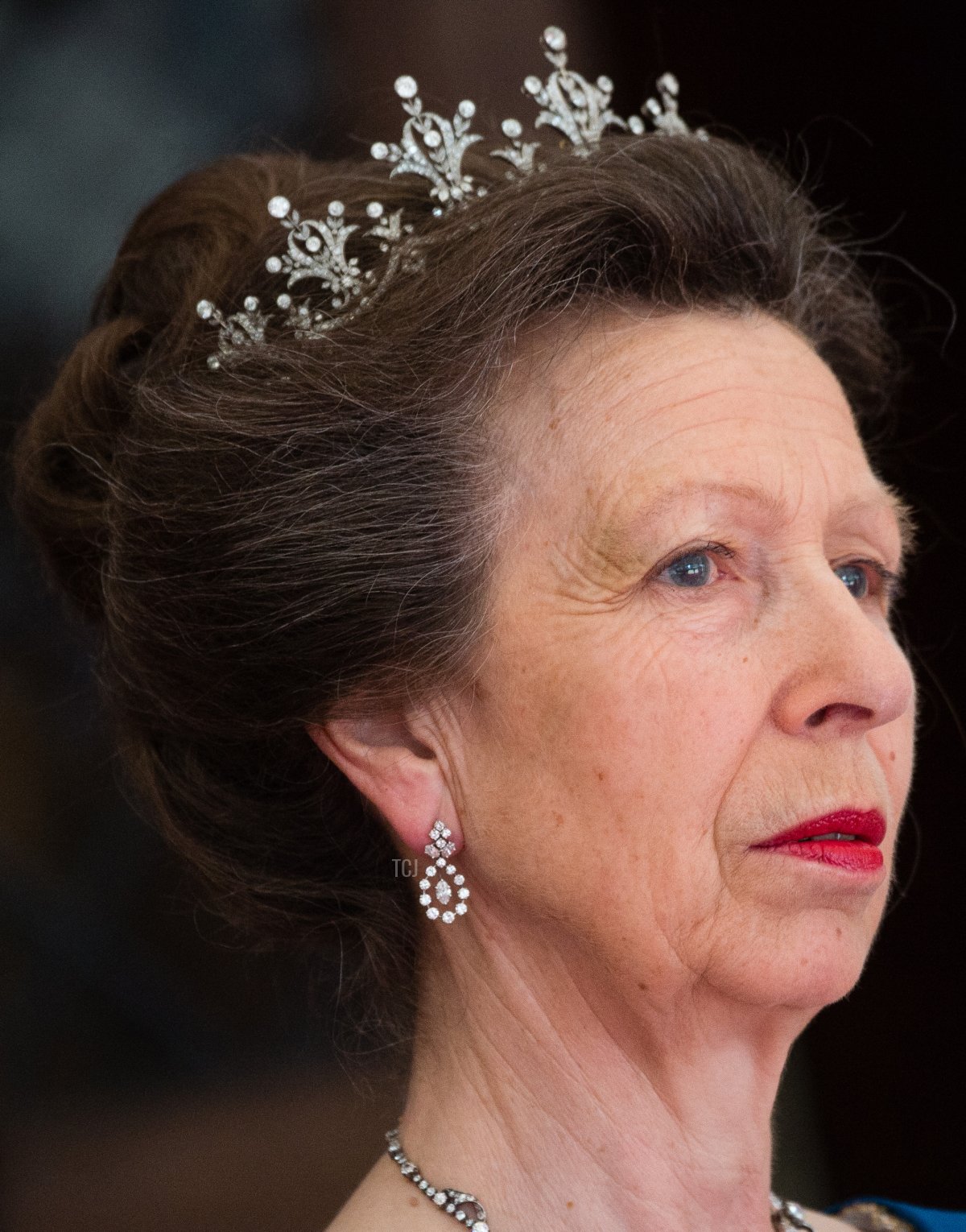 Here’s a look at Anne wearing the same earrings during a Guildhall banquet in honor of the King and Queen of Spain in the summer of 2017. The earrings were an eighteenth-birthday gift to Anne from her parents, the Queen and the Duke of Edinburgh. They’re part of a suite of diamond jewels that also includes her diamond festoon necklace.