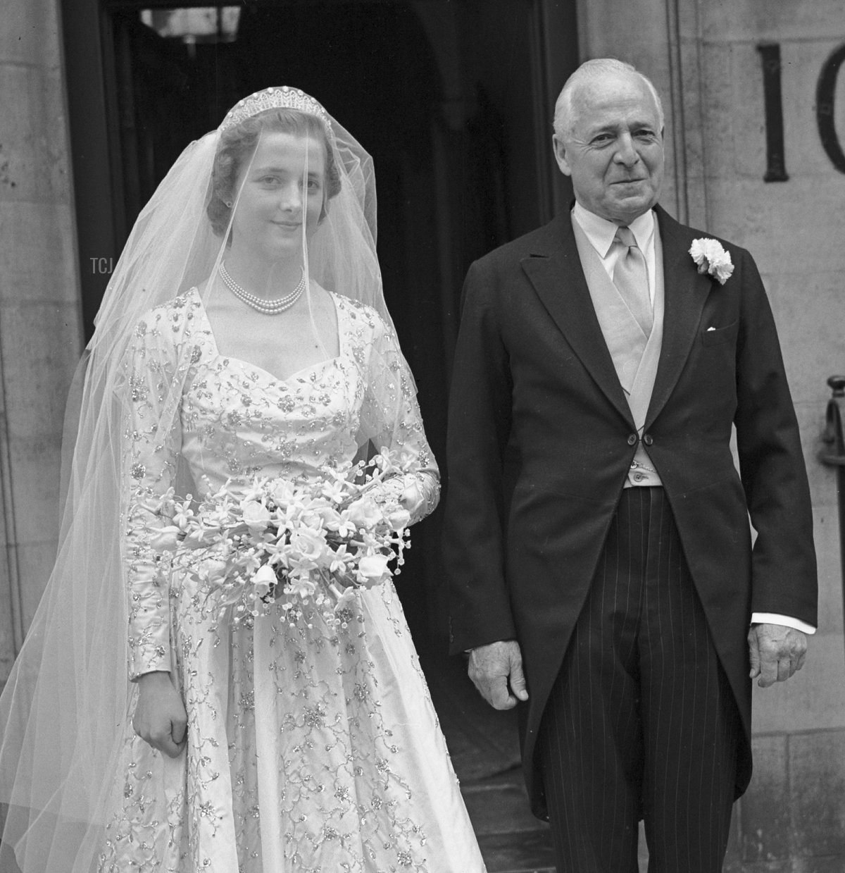 Let’s begin in the spring of 1954. On June 1, the Hon. Frances Roche, daughter of Lord and Lady Fermoy, married John Spencer, Viscount Althorp (an equerry to the Queen) at Westminster Abbey. Above, 18-year-old Frances is pictured with her father as they leave their home in Wilton Crescent to travel to the ceremony. Frances wore the all-diamond Fermoy Tiara, plus an elegant triple strand of pearls, with her wedding gown. Johnny and Frances had five children, four of whom survived to adulthood, before their divorce in 1969.