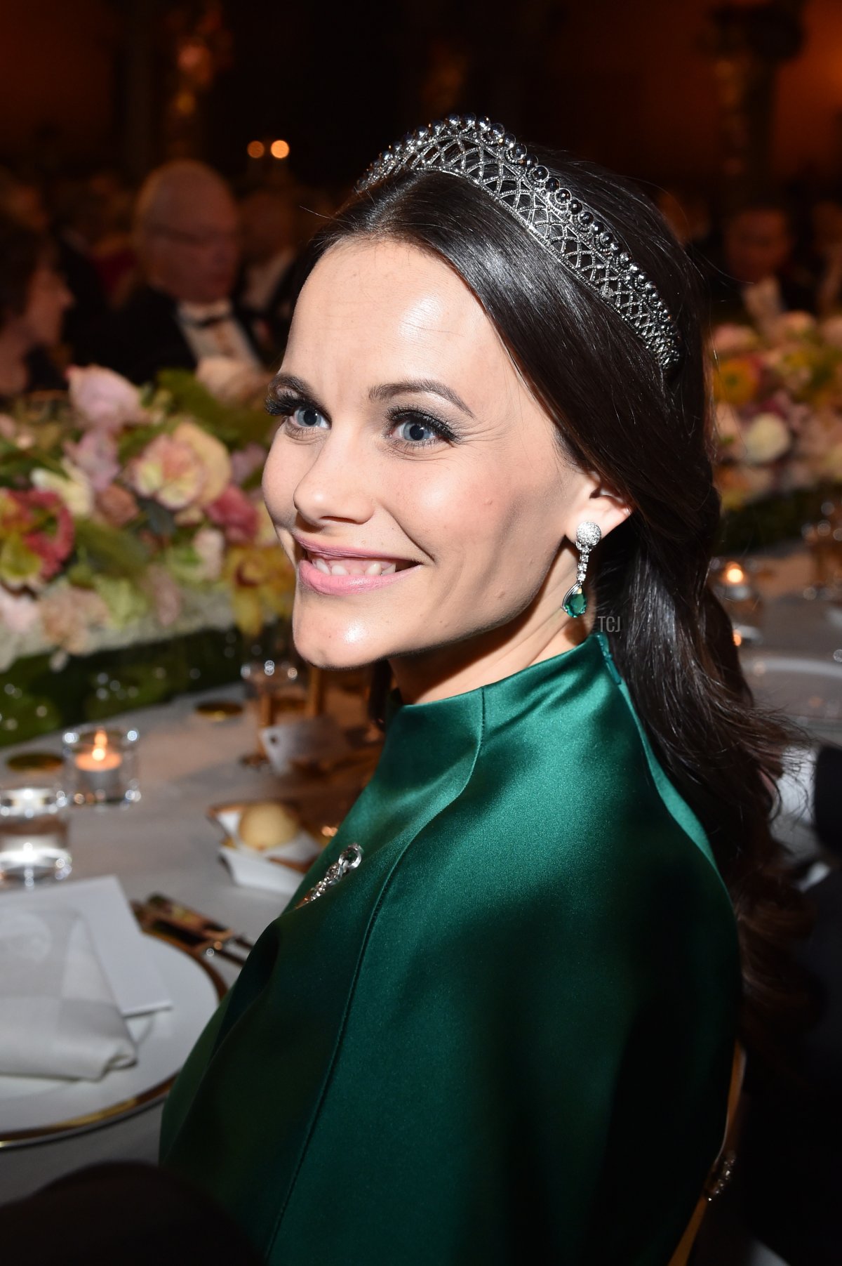 Princess Sofia paired the tiara with diamond and emerald earrings, as well as a diamond floral brooch.