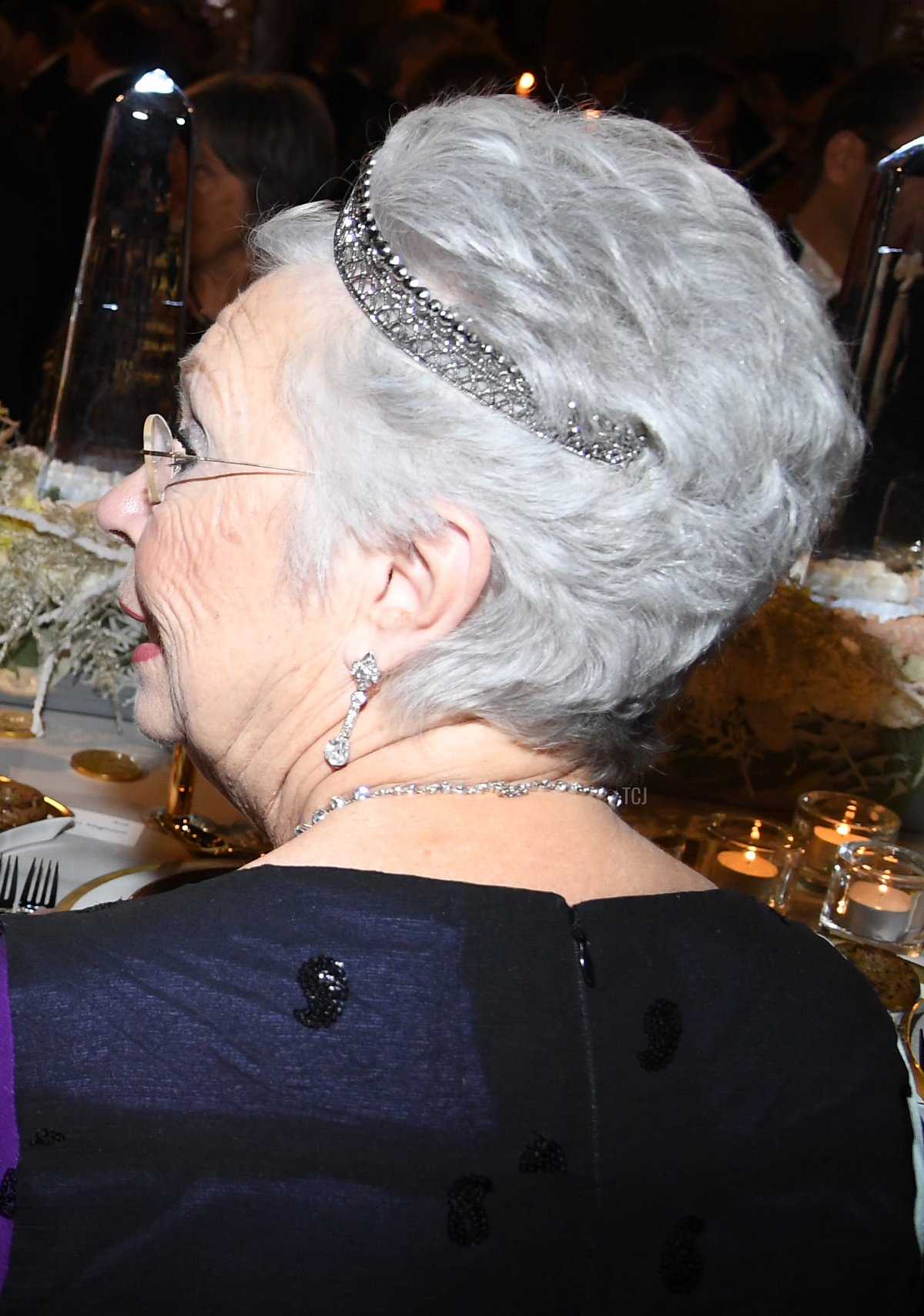 She wore the tiara with diamonds. This side view offers us a good look at the length of the tiara, which wraps around to the back of the wearer’s head.