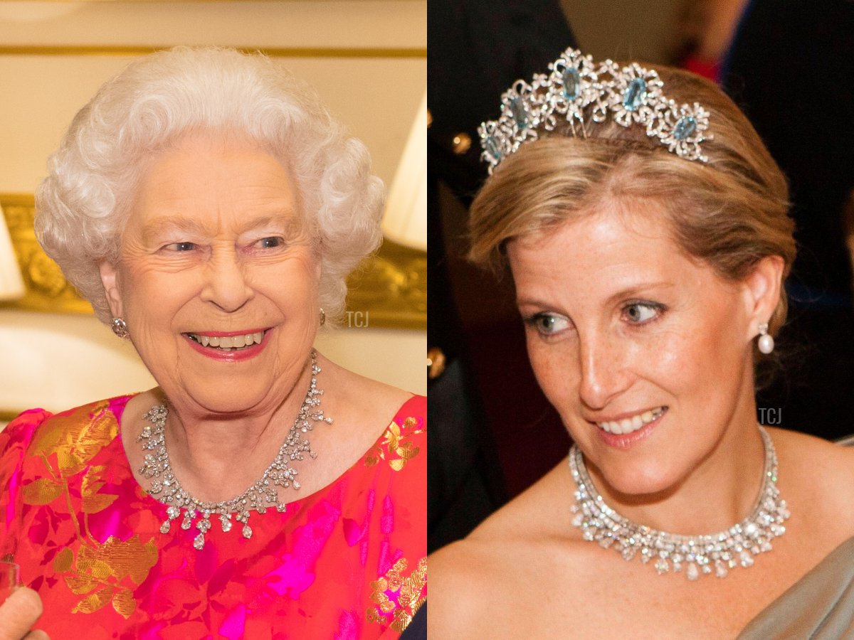 Made by Harry Winston in the 1950s, this diamond and platinum necklace was given to Queen Elizabeth II by King Faisal of Saudi Arabia in 1967. The piece is set with more than 300 diamonds, including baguettes, brilliants, and eleven pear-shaped diamonds set as pendant stones. She has made it a regular part of her gala jewelry wardrobe, and she’s also lent it to other members of the family. Diana, Princess of Wales wore the jewel in Australia in 1983, and the Countess of Wessex wore it in Luxembourg in October 2012.