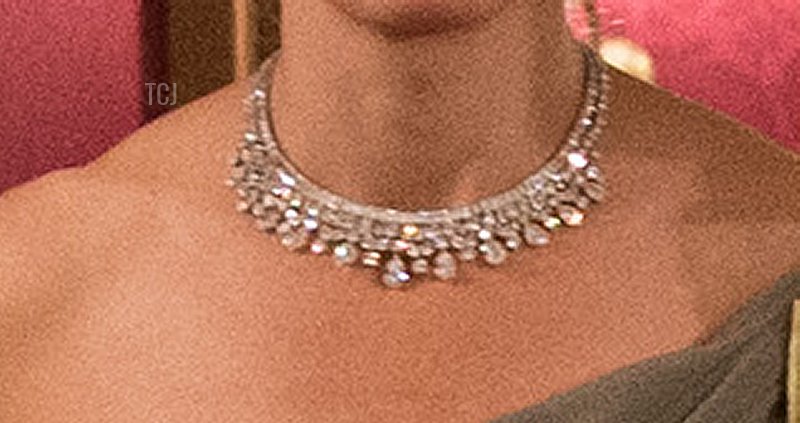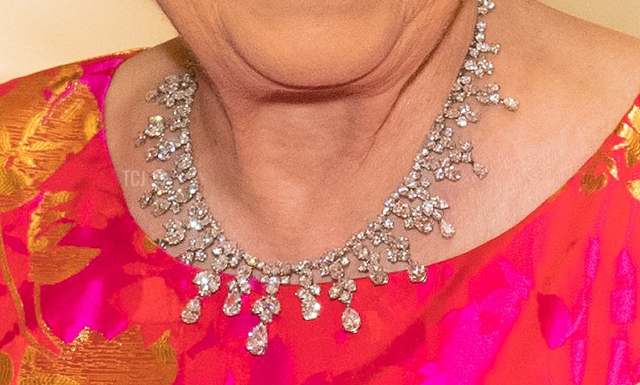 King Khalid of Saudi Arabia gave this diamond and platinum necklace to the Queen in 1979, when she visited Saudi Arabia during an extensive tour of several Middle Eastern nations. The piece features pear-shaped diamonds in a modern fringe setting. When King Khalid made a state visit to the United Kingdom a few years later, in June 1981, the Queen wore the necklace for a banquet held at Claridge’s in London. The Queen often wears the necklace, which was made by Harry Winston, for gala events.