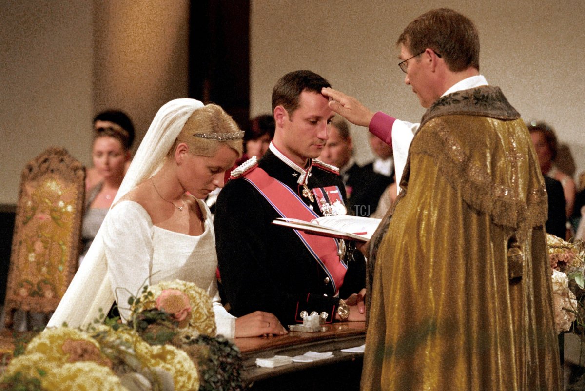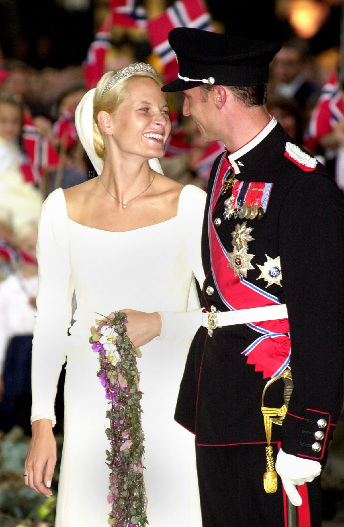 More than 100,000 people lined the streets of Oslo on the wedding day. Inside the cathedral, the Bishop of Oslo declared, “A crown prince has a demanding legacy. Only love can transform destiny into a vocation. Only love can transform duty into a gift.” He added, “Mette-Marit, you show courage and faith in saying yes to an unknown future. You are beginning a new chapter, with the pages still unwritten. You do this with dignity. Your love for your son shows both tenderness and determination. As a single mother you have set an example in the way you have cared for your child.” Her four-year-old son, Marius, was a page boy during the ceremony, and posed on the balcony with his mother and stepfather after the ceremony had ended.