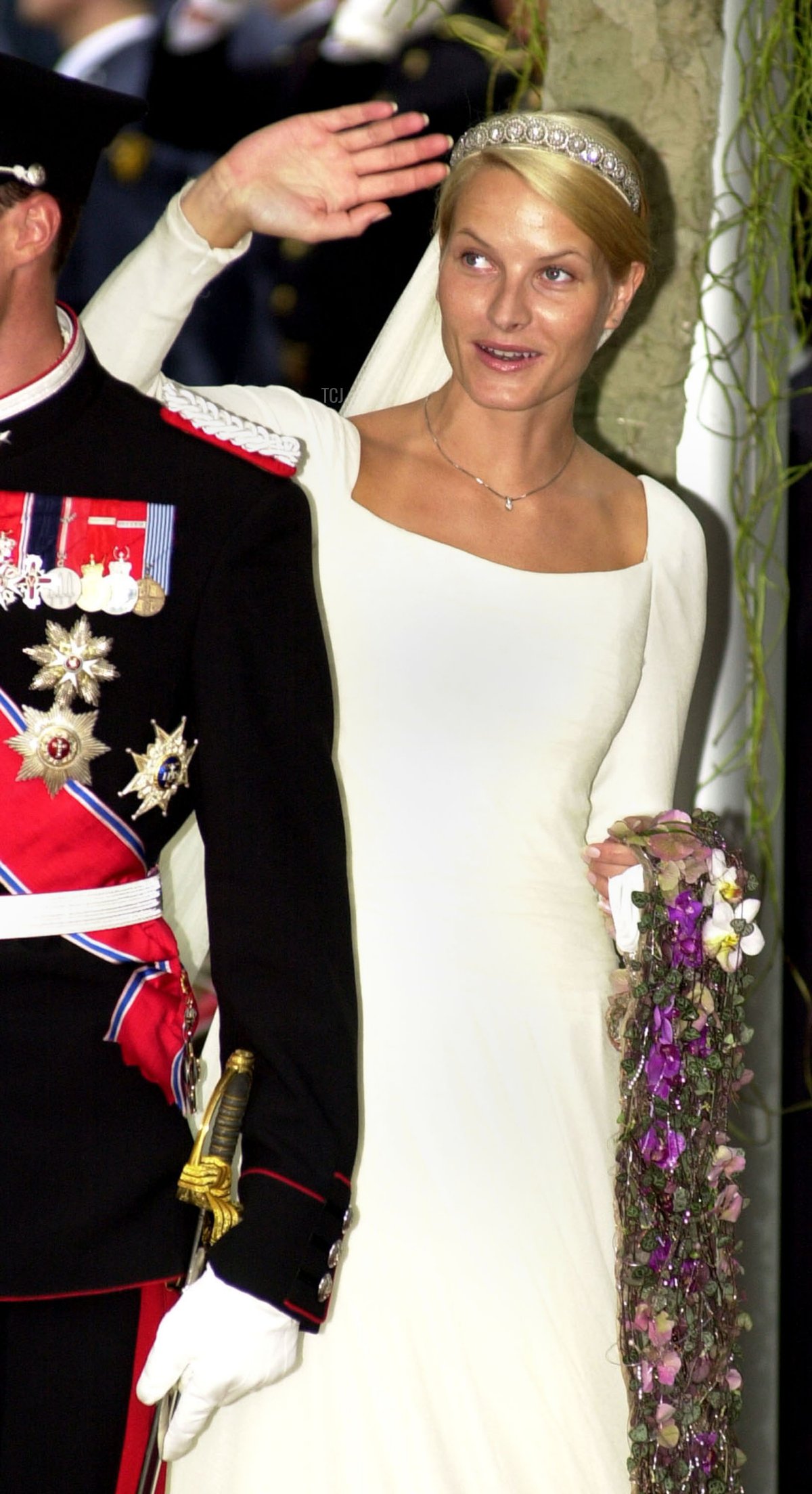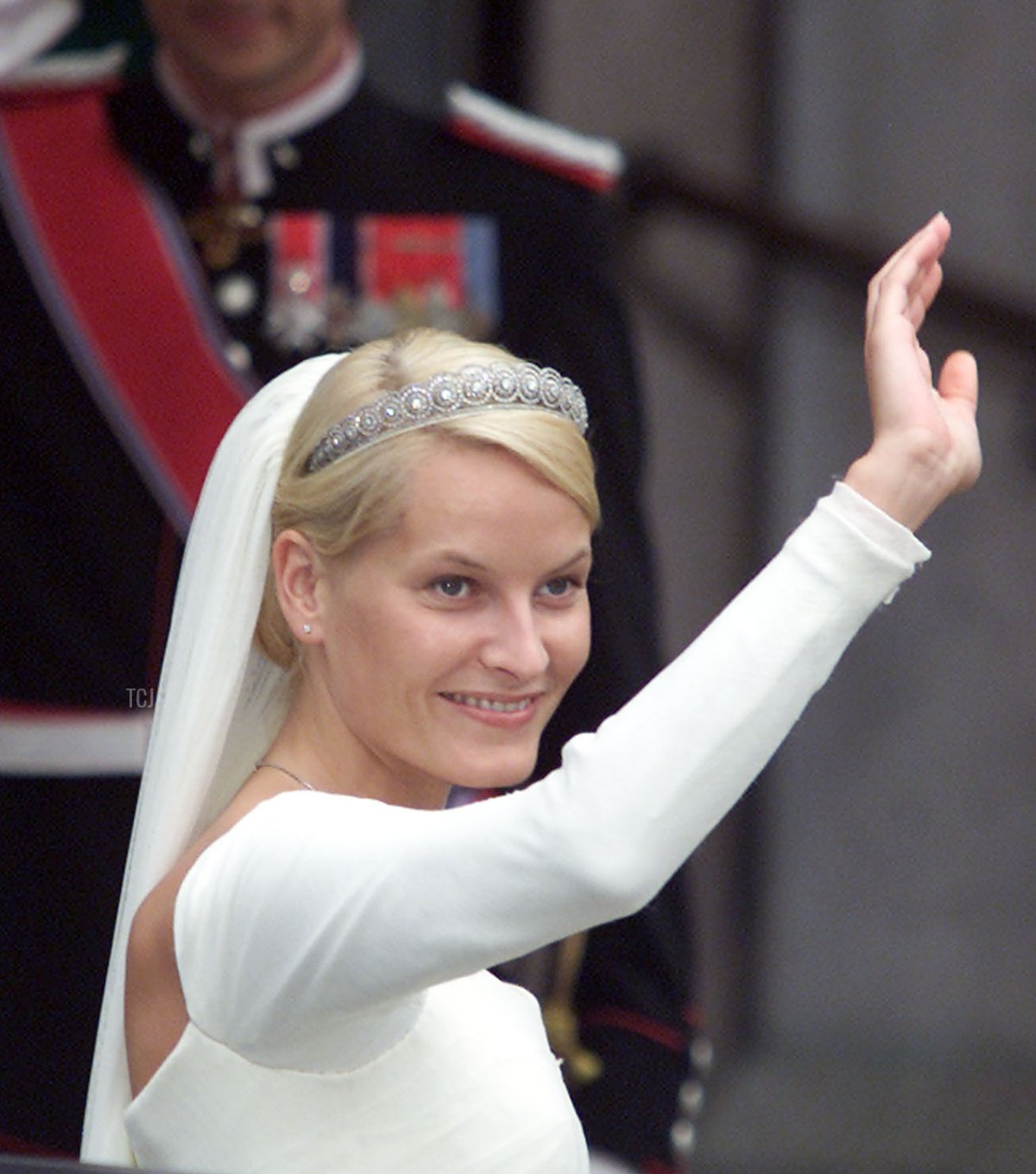 Mette-Marit’s wedding jewels were equally minimal. The major piece she wore on the day was the Diamond Daisy Bandeau, a petite tiara of diamond-set blossoms that was made in 1910. The tiara was a wedding gift from her new parents-in-law, King Harald V and Queen Sonja of Norway.
