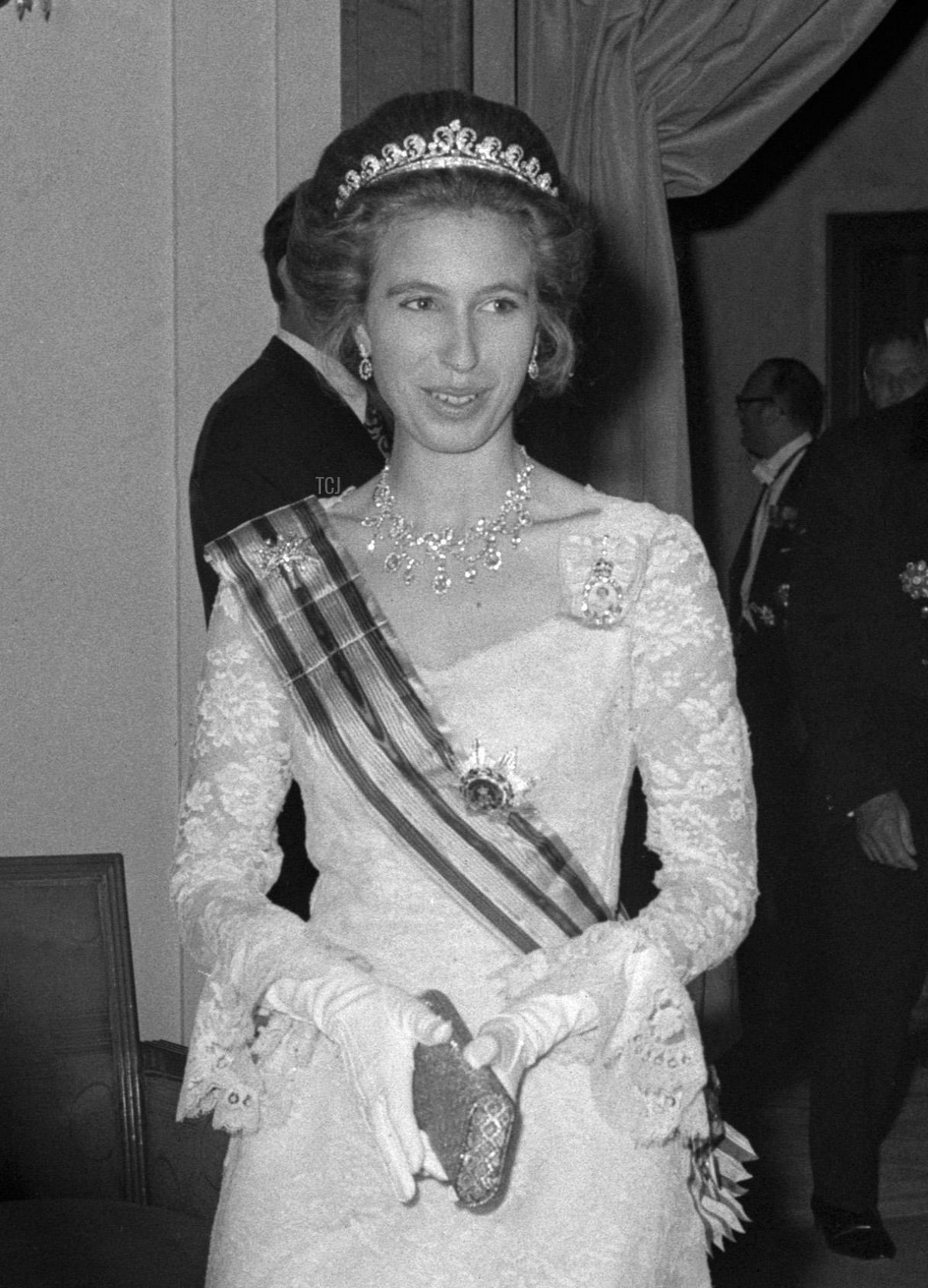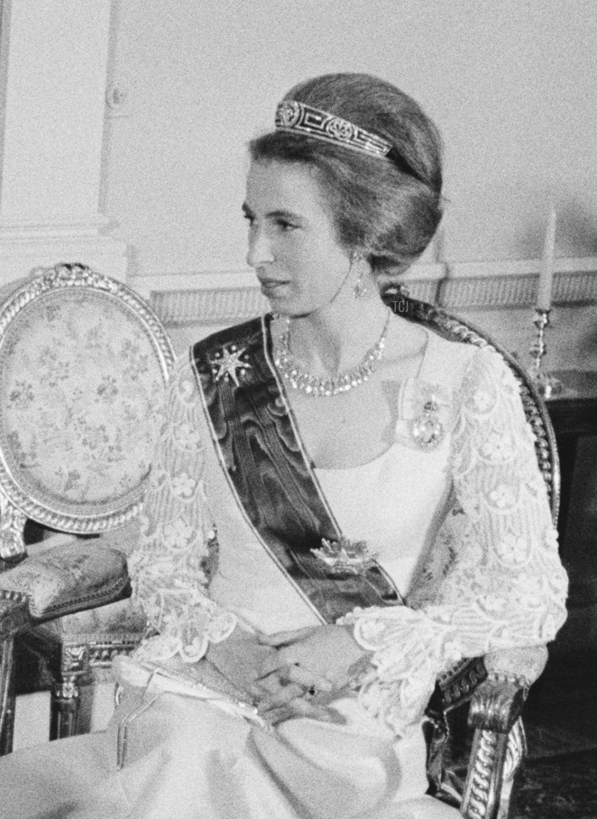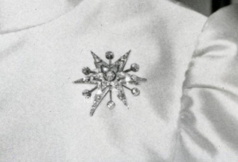 The star brooch anchored the sash of Anne’s Luxembourgish order, the Order of the Oak Crown, for a dinner at Claridge’s during a state visit from Grand Duke Jean and Grand Duchess Josephine Charlotte of Luxembourg in June 1973. She wore the brooch with the Cartier Halo Tiara and her Diamond Festoon Suite.