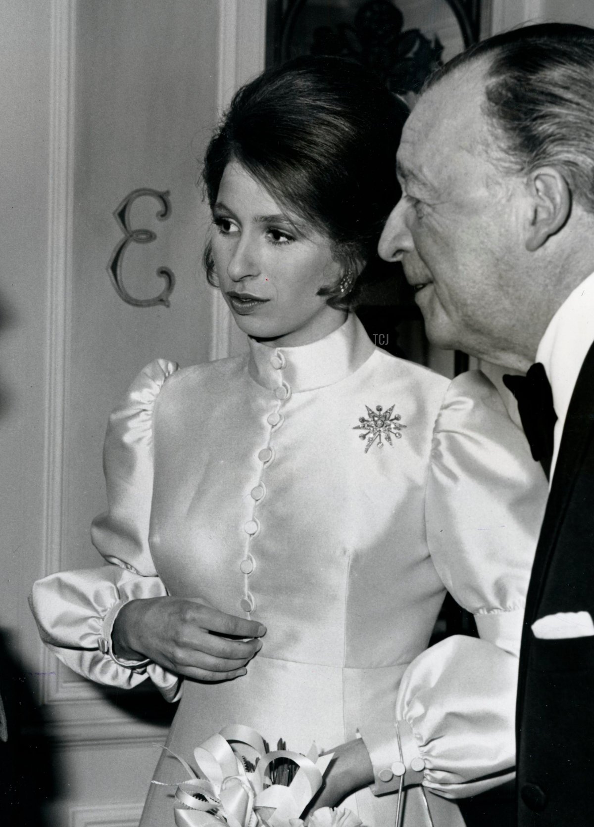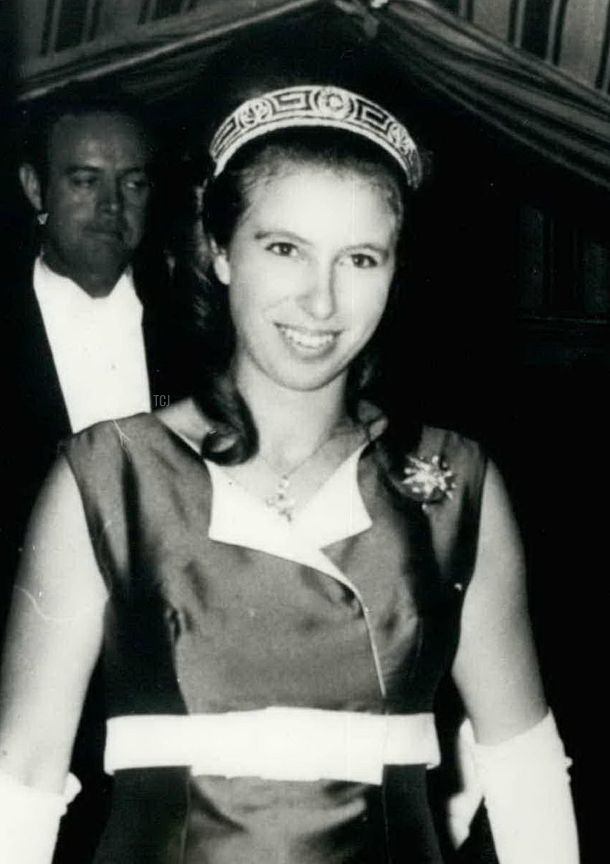 The brooch has been in Princess Anne’s jewelry collection for more than half a century. She began wearing it around 1970, the year she turned 20. Above, she is pictured wearing the brooch pinned to a dark green and white evening gown, worn in May 1970 for a banquet at the Goldsmith’s Hall in London celebrating the bicentenary of Spode. She wore the brooch with Princess Andrew’s Meander Tiara and a necklace with a sparkling pendant.