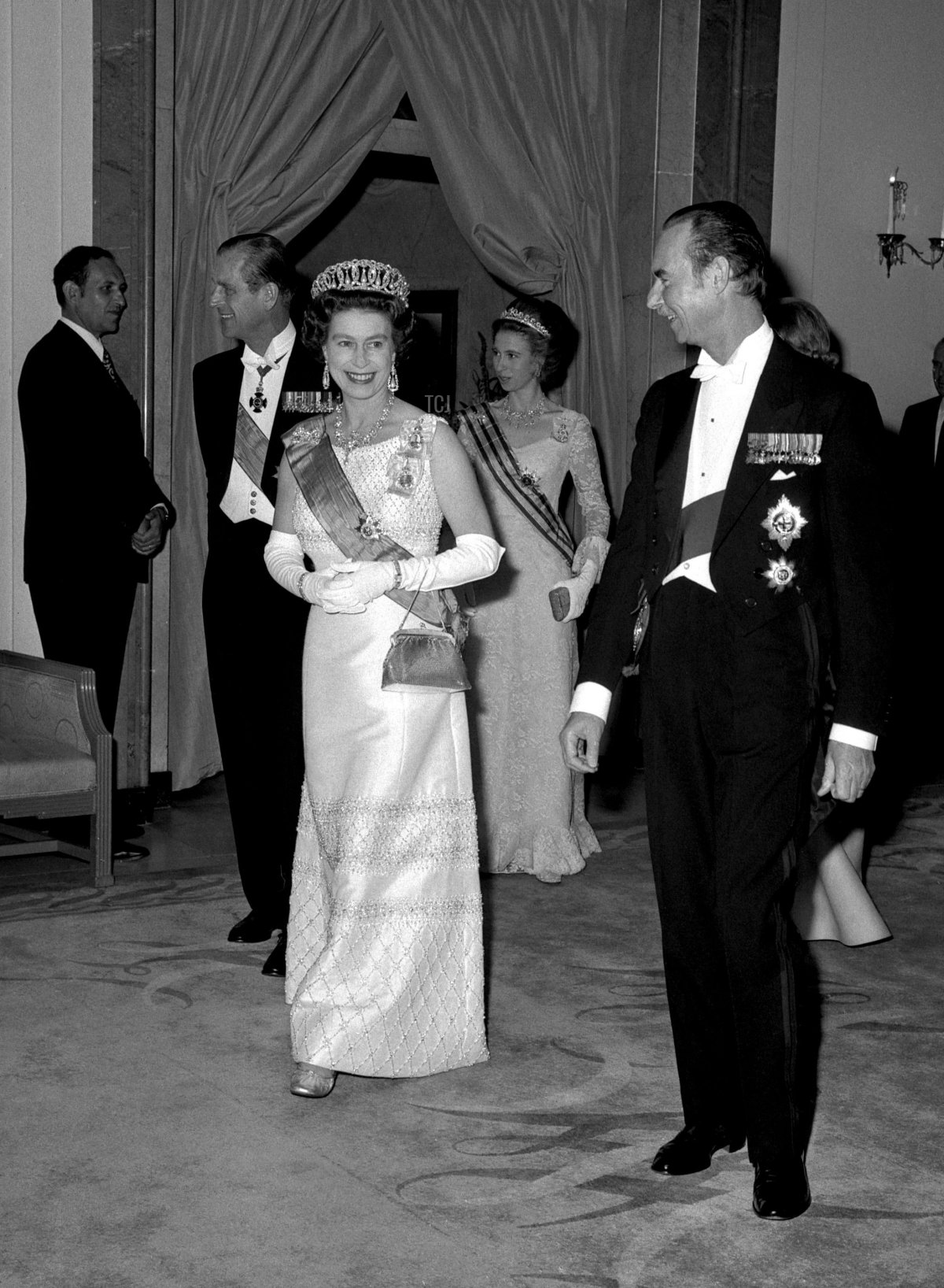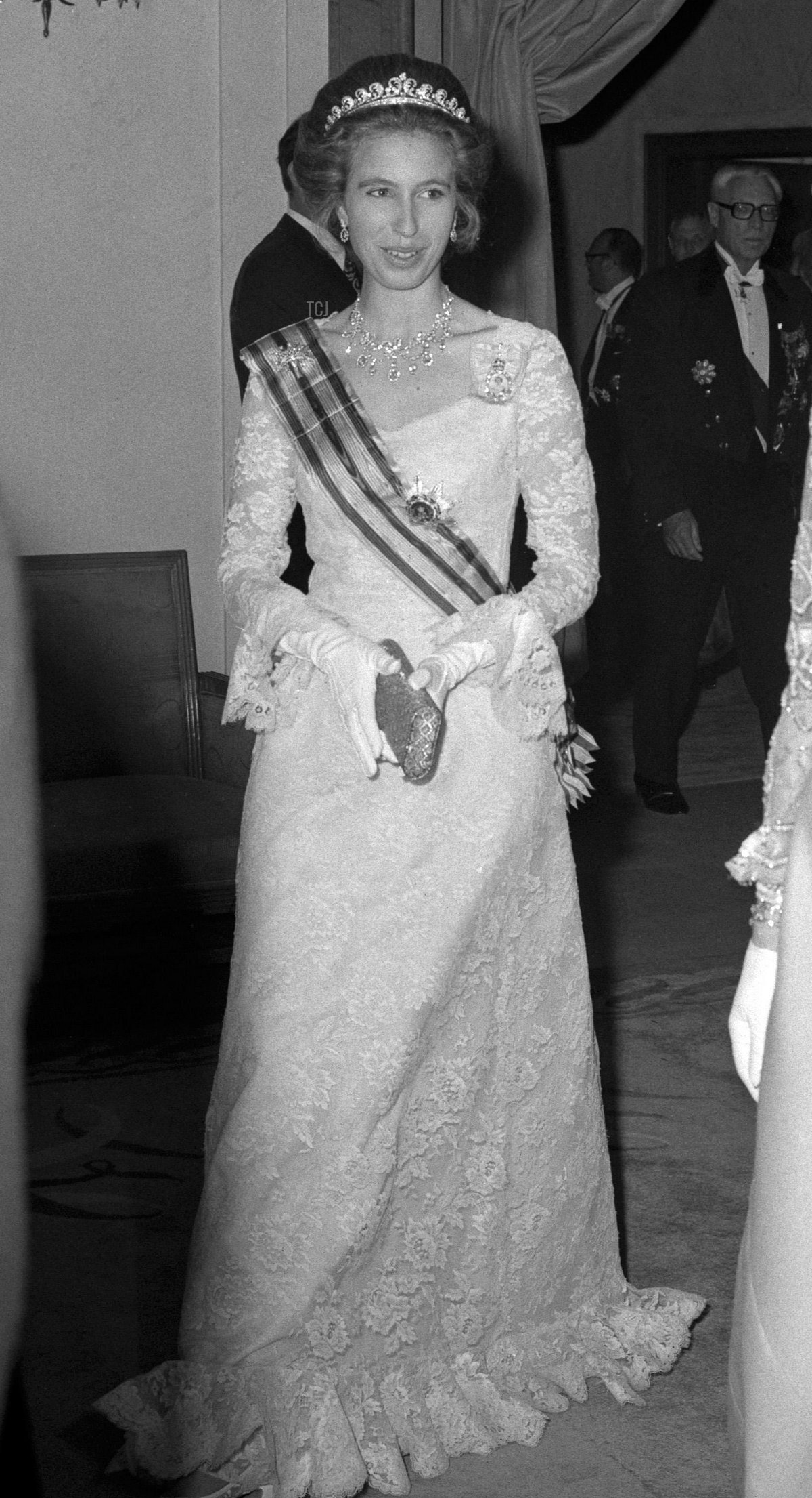 The first two days of the visit included the traditional rounds of banquets, dinners, and receptions in London. On June 14, 1972, the second evening of the visit, the Grand Duke and Grand Duchess hosted a dinner for the royals at Claridge’s in London. Princess Anne wore a gown with a lace overlay for the dinner, with the sash and star of the Order of the Oak Crown. Anne received the Luxembourgish order from Grand Duke Jean during this visit. She also wore her mother’s Royal Family Order.
