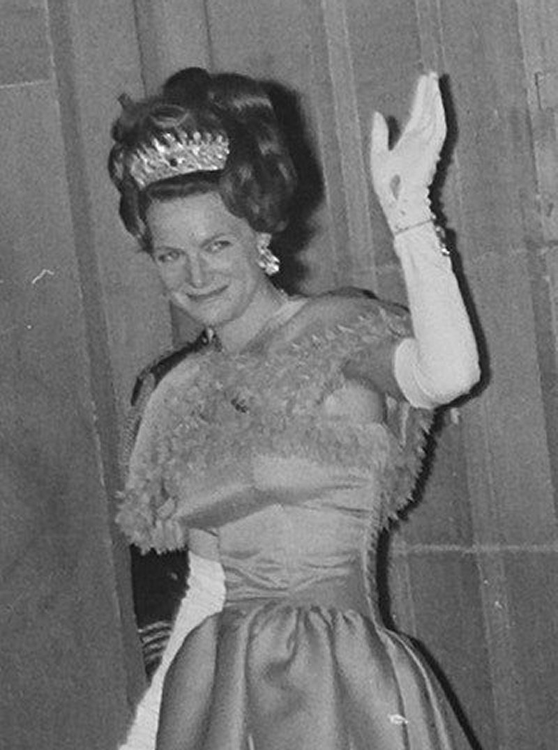 For the ball, Irene wore a glamorous gown with a feathered capelet. In her impressive ’60s hairstyle, she nestled the Bourbon-Parma Tiara. On this occasion, she swapped out the tiara’s central diamond for a ruby. She also wore her own ruby and diamond earrings.