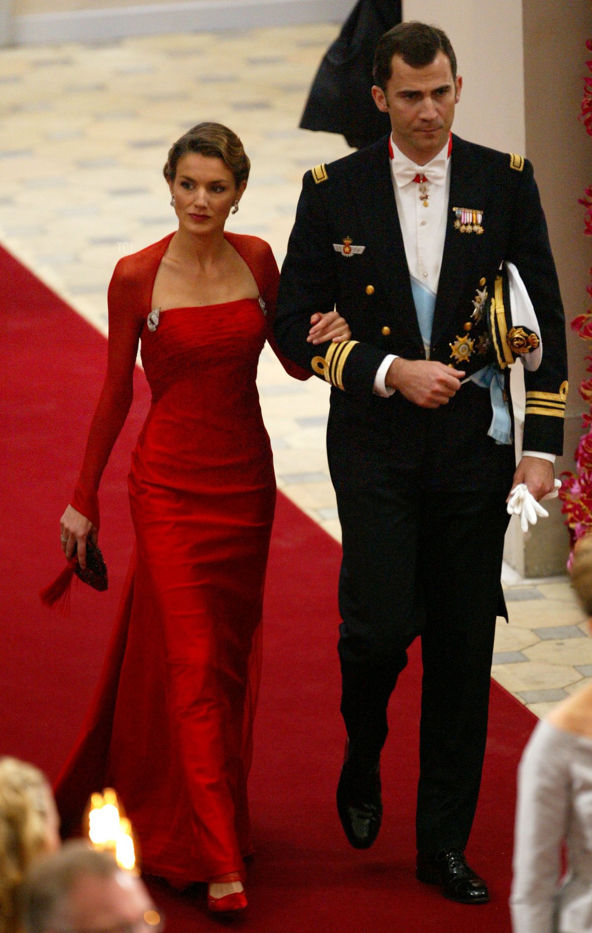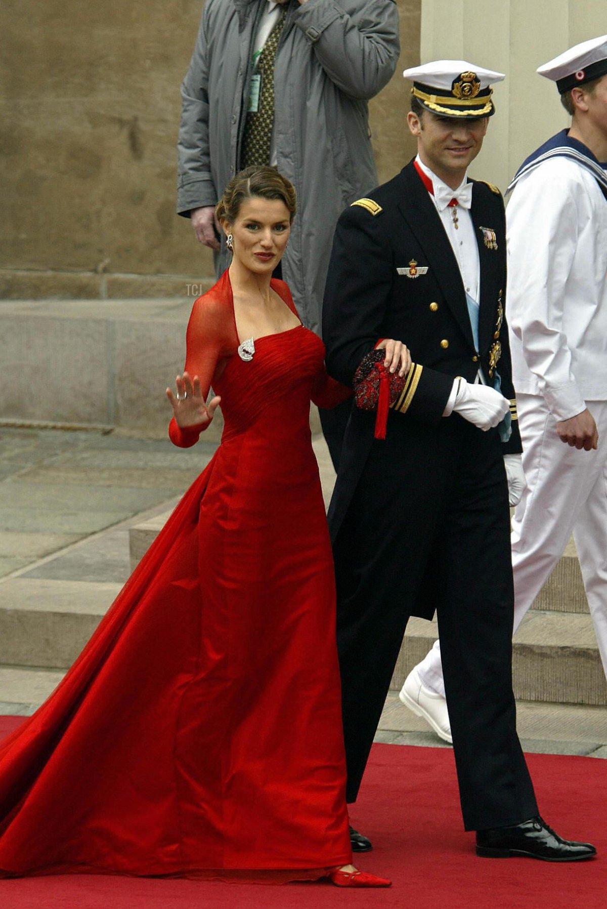On the day of the wedding, Felipe and Letizia arrived at the cathedral in Copenhagen in full gala attire. Letizia wore a dramatic red gown with a short train and long sleeves.