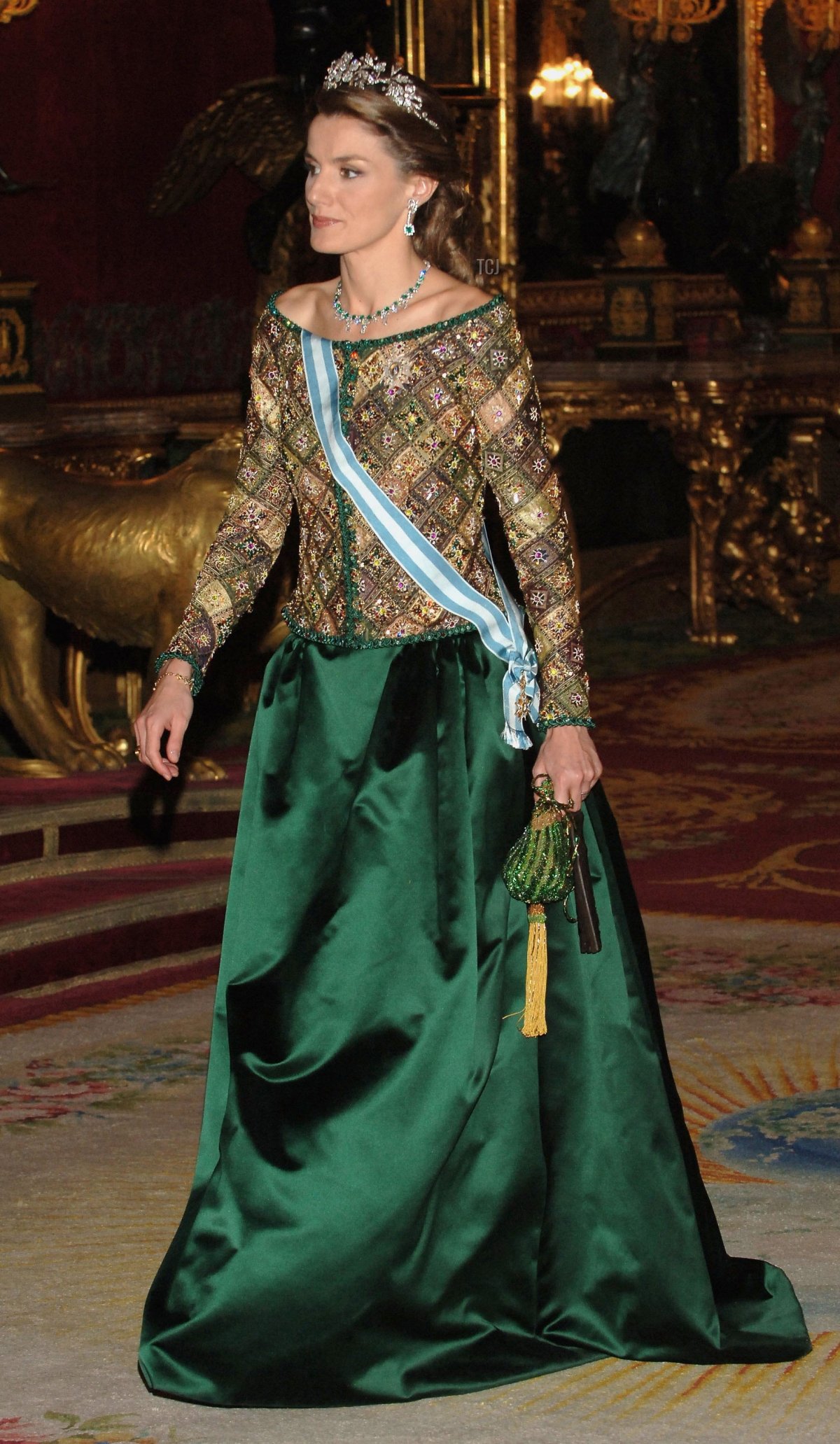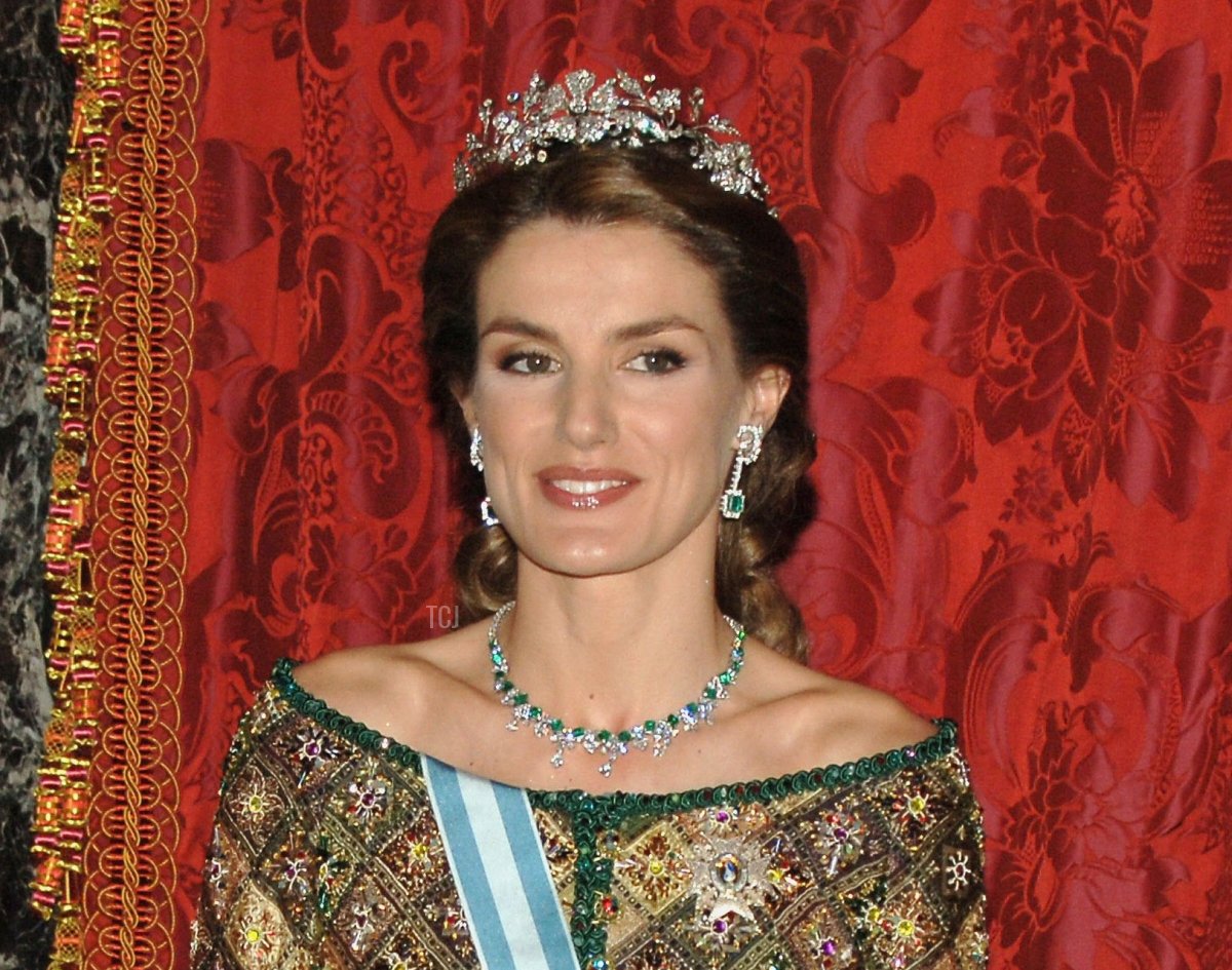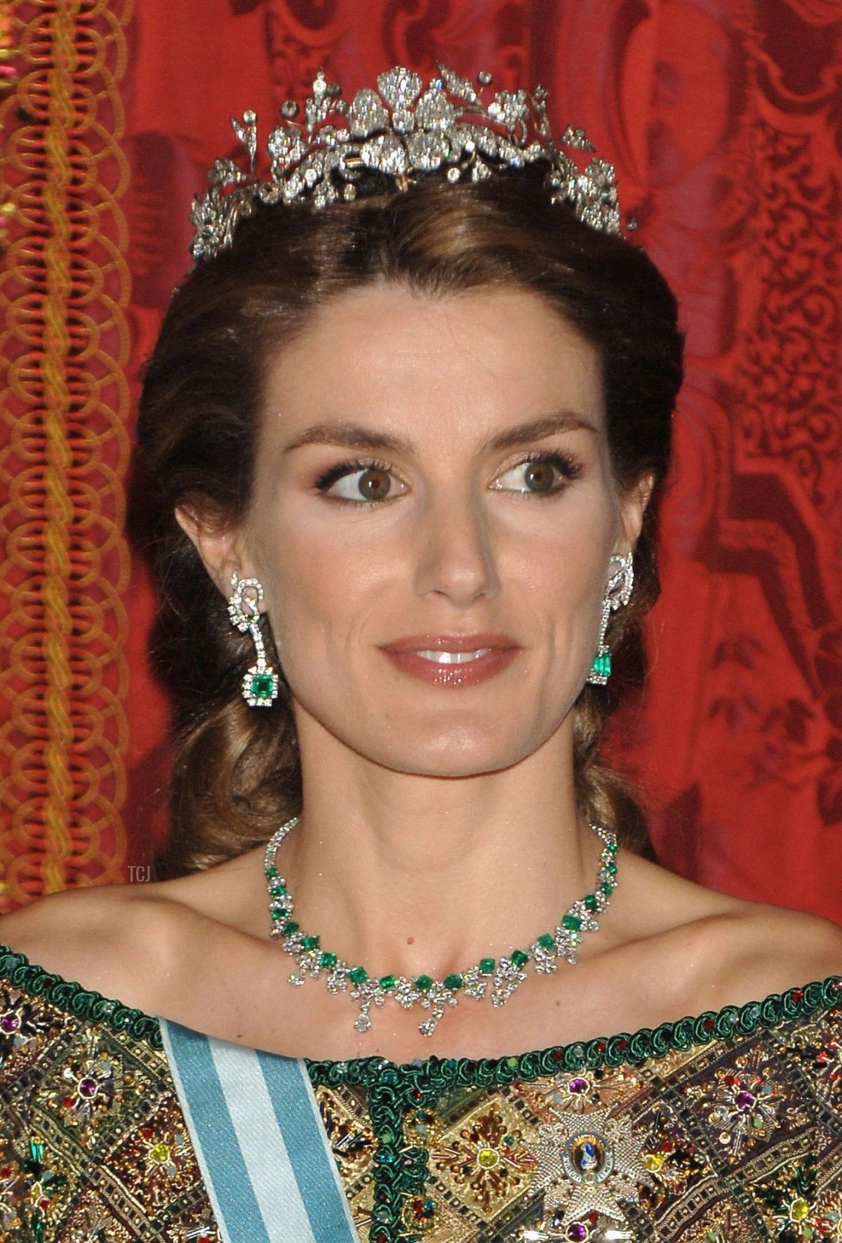 Letizia paired the diamond floral tiara with a modern suite of diamond and emerald jewels. The necklace and earrings also belong to her mother-in-law, Queen Sofia. In fact, two years earlier, Sofia wore both pieces (plus an emerald bracelet and ring) at Felipe and Letizia’s royal wedding in Madrid.