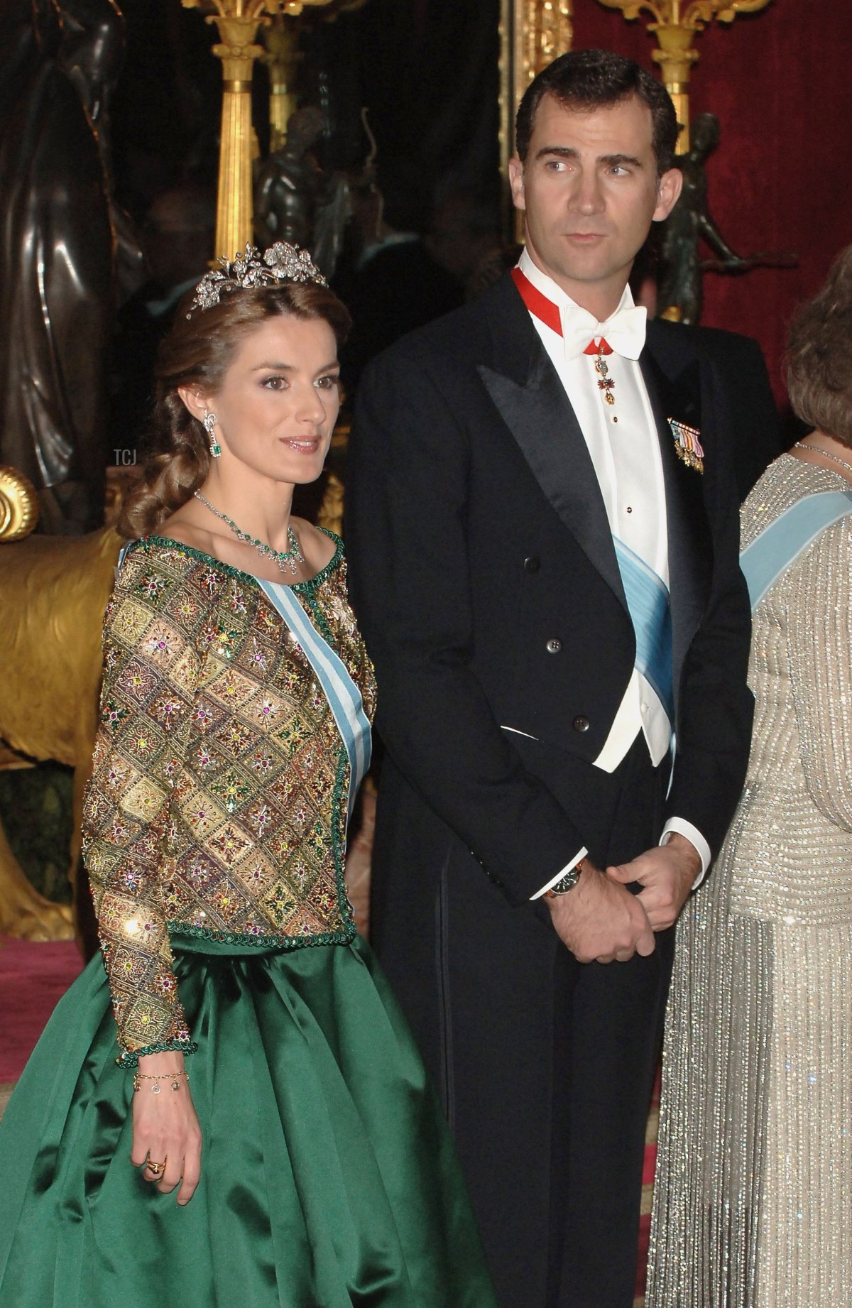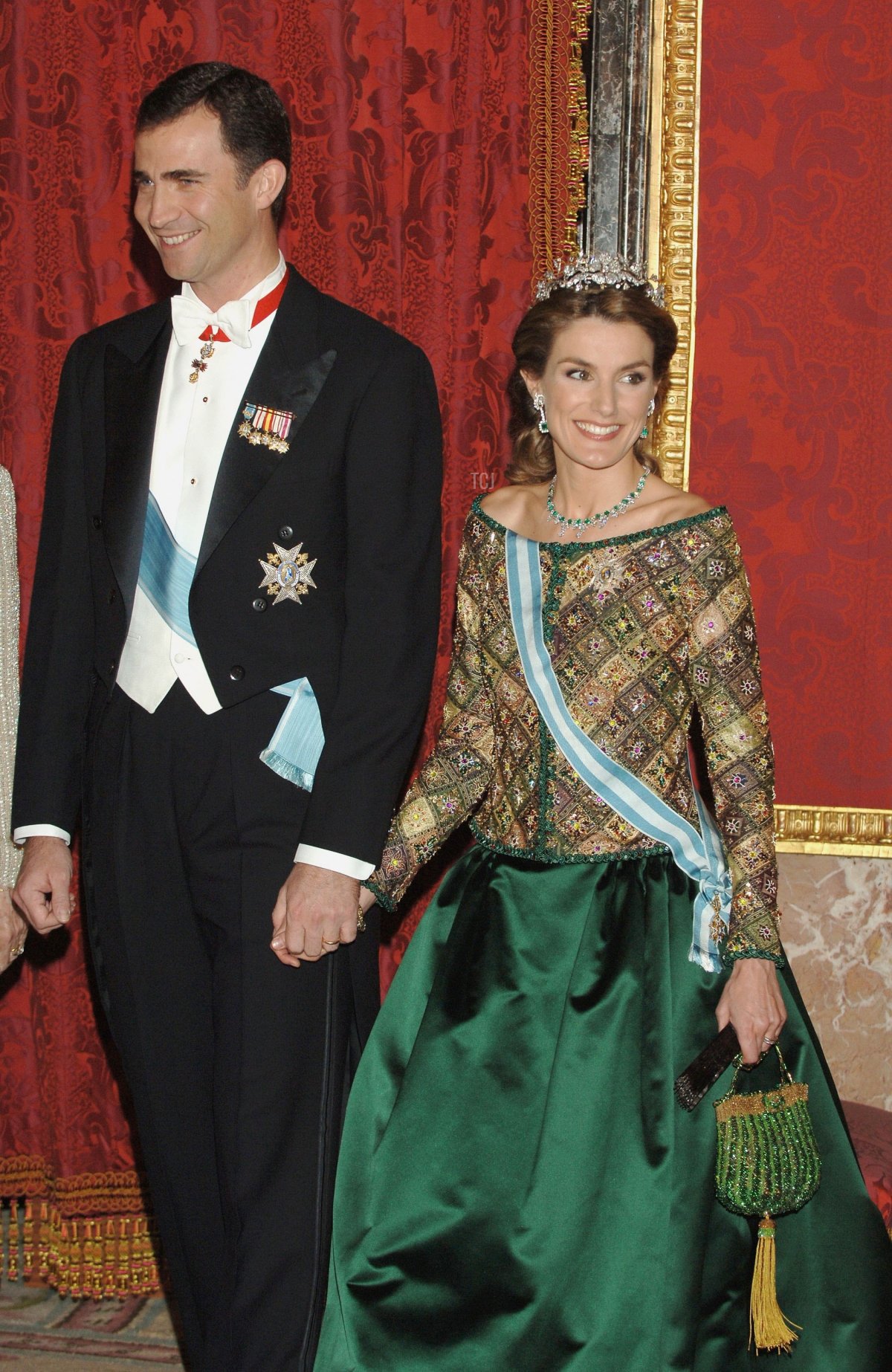 The Spaniards welcomed the Russians to Madrid for a state visit in February 2006, and the program included a grand state banquet at the Royal Palace. King Juan Carlos and Queen Sofia were accompanied by Prince Felipe, Princess Letizia, Infanta Cristina, and Inaki Urdangarin for the event. It was one of Letizia’s first formal events after the birth of her first child, Infanta Leonor, in October 2005.