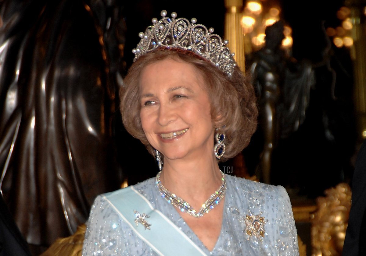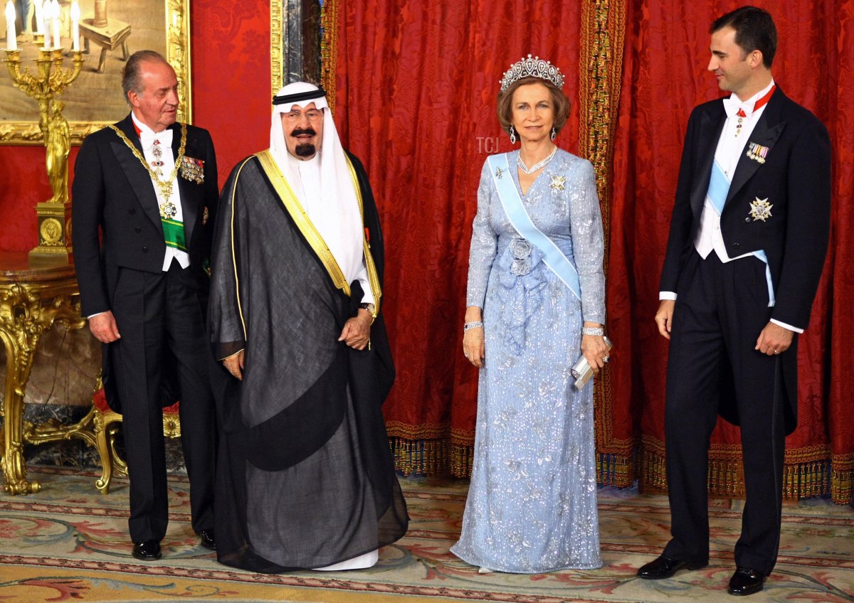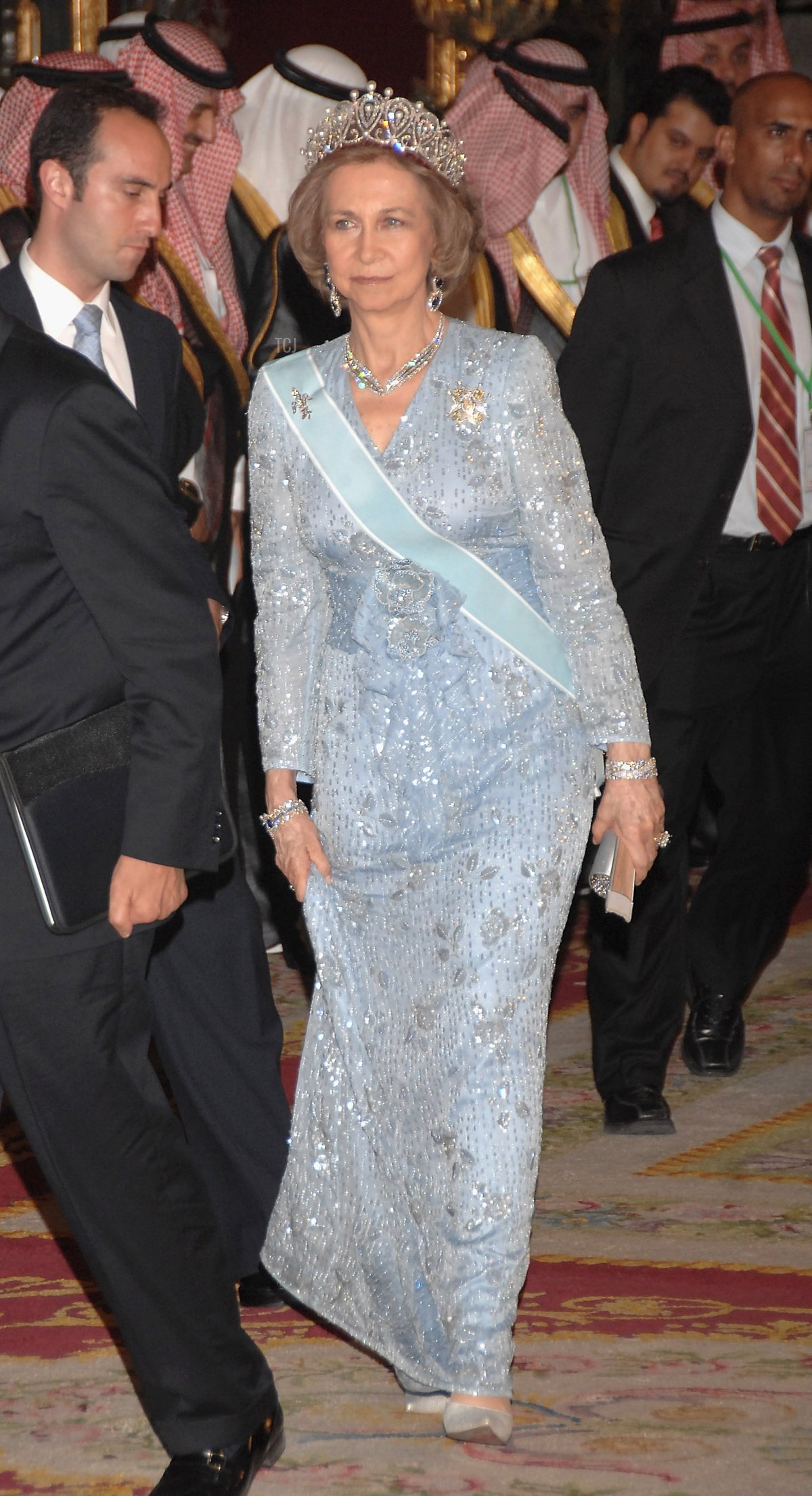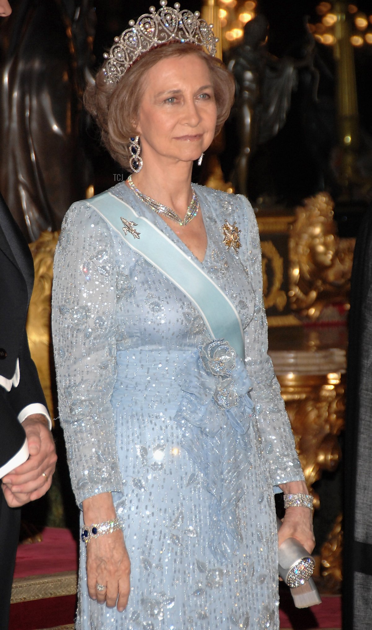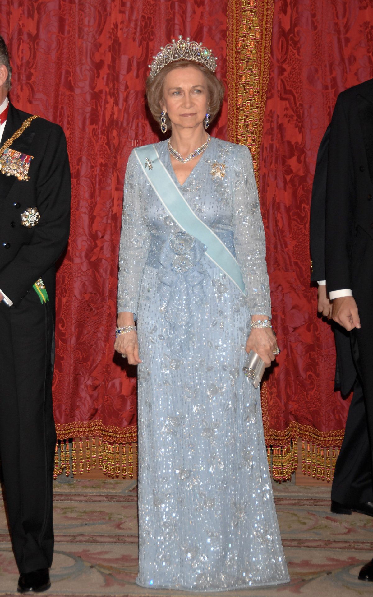 King Juan Carlos, Queen Sofia, and Prince Felipe welcomed King Abdullah of Saudi Arabia to Spain for a gala dinner at the Royal Palace in Madrid in June 2007. Queen Sofia wore a light blue dress with sparkling embellishments for the occasion, along with the light blue and white sash of the Order of Carlos III.