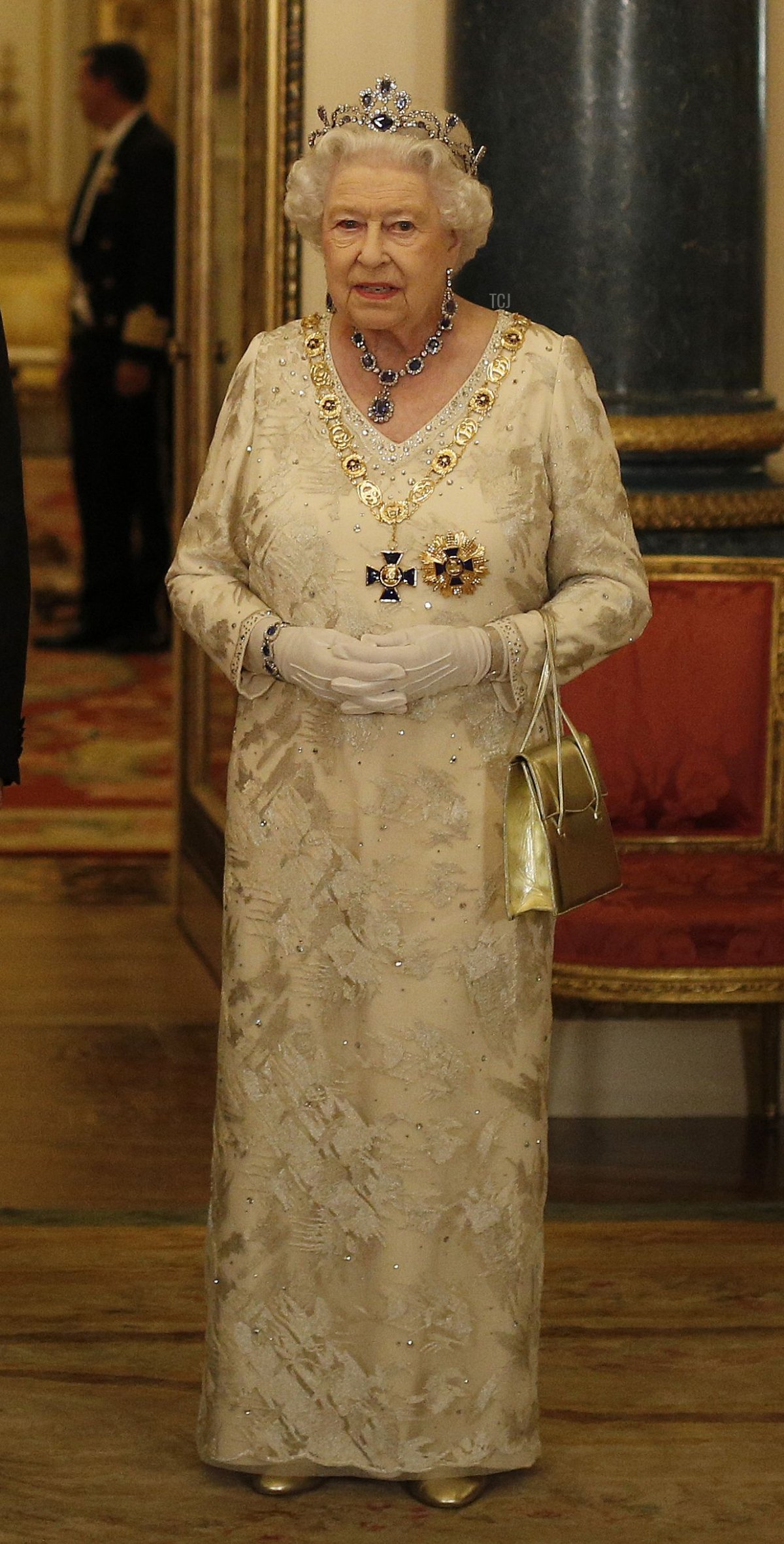 For the dinner, the Queen wore a gorgeous blue and gold ensemble. Her gown, made of textured and embellished golden fabrics, was accessorized with a matching handbag and shoes. The gown and jewels tied in perfectly with the colors of her Colombian decoration, the Order of Boyaca. The grand collar of the order is made of gold, with a blue and gold badge. The star of the order is also blue and gold.