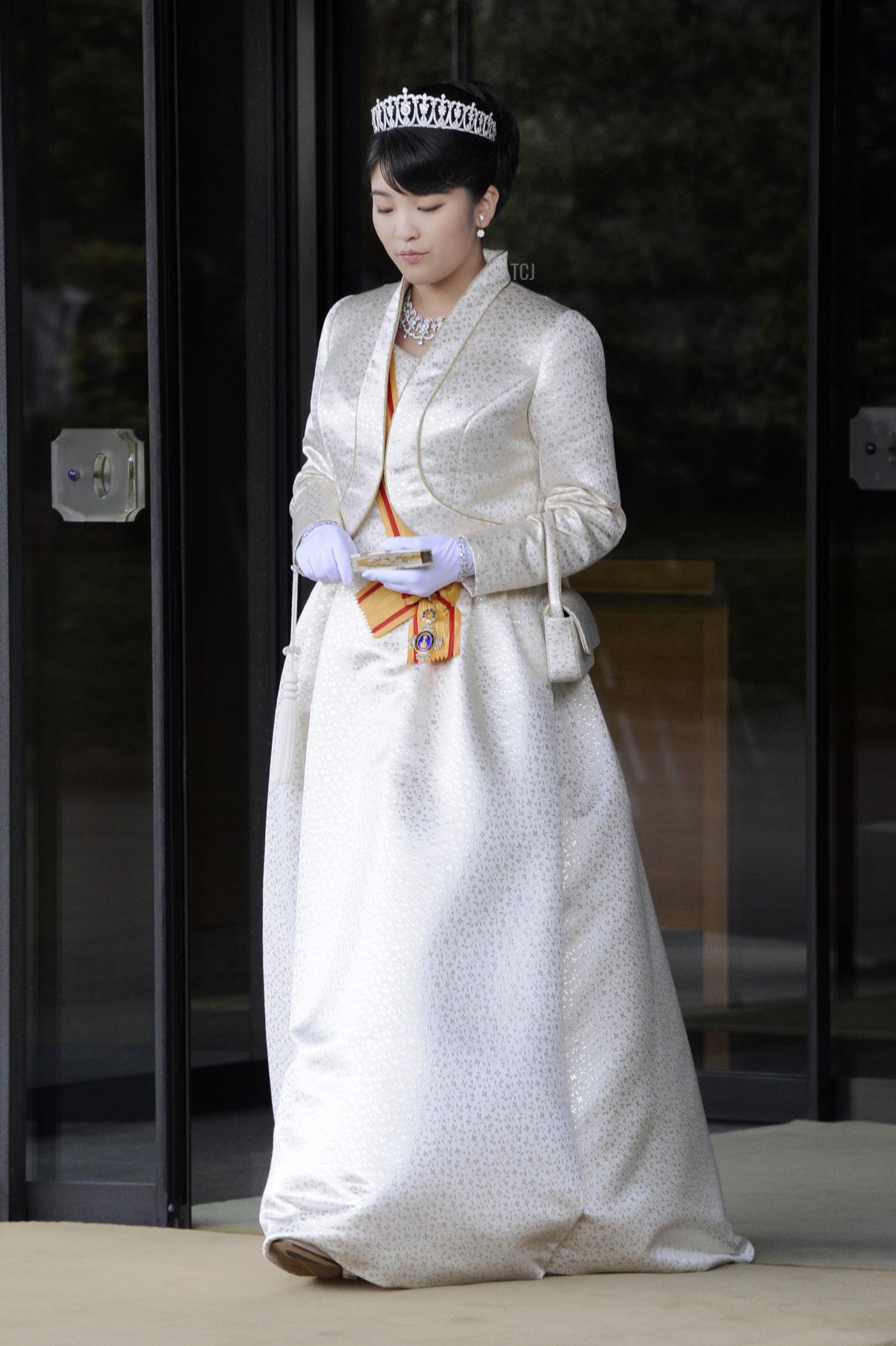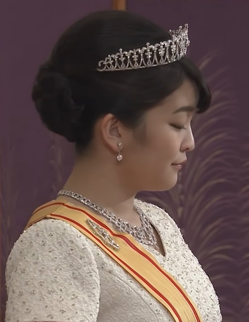Princess Mako appeared in full Japanese court dress for the first time that day. She made an official visit to the Imperial Palace to meet with her grandparents, Emperor Akihito and Empress Michiko. With her white and gold gown, she wore her new parure of diamond jewelry: a tiara, earrings, necklace, brooch, and bracelet. The festoon tiara’s floral motif was a play on her mother’s imperial symbol, the iris setosa. The jewels were made by the Japanese jewelry firm Wako.