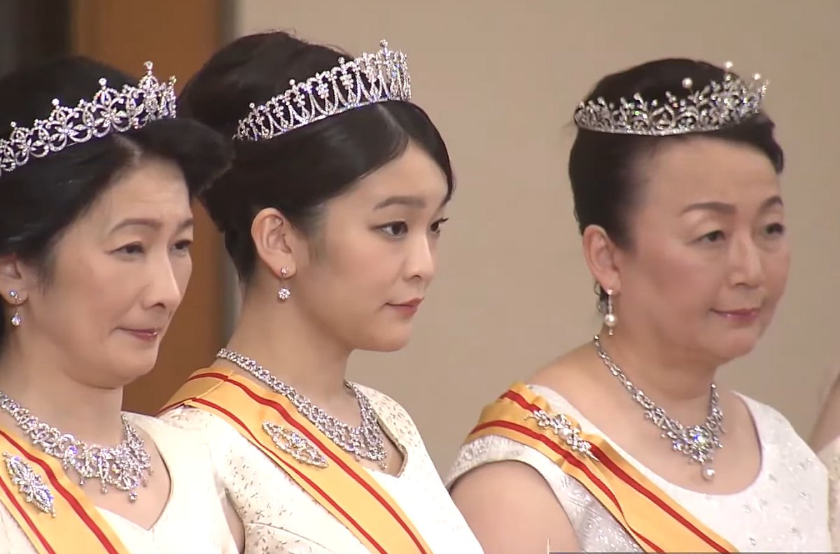 And here she is, once again standing between her mother and her sister, for the imperial New Year celebration in January 2016. You can learn more about the tiaras worn by all three of the Akishino princesses here.