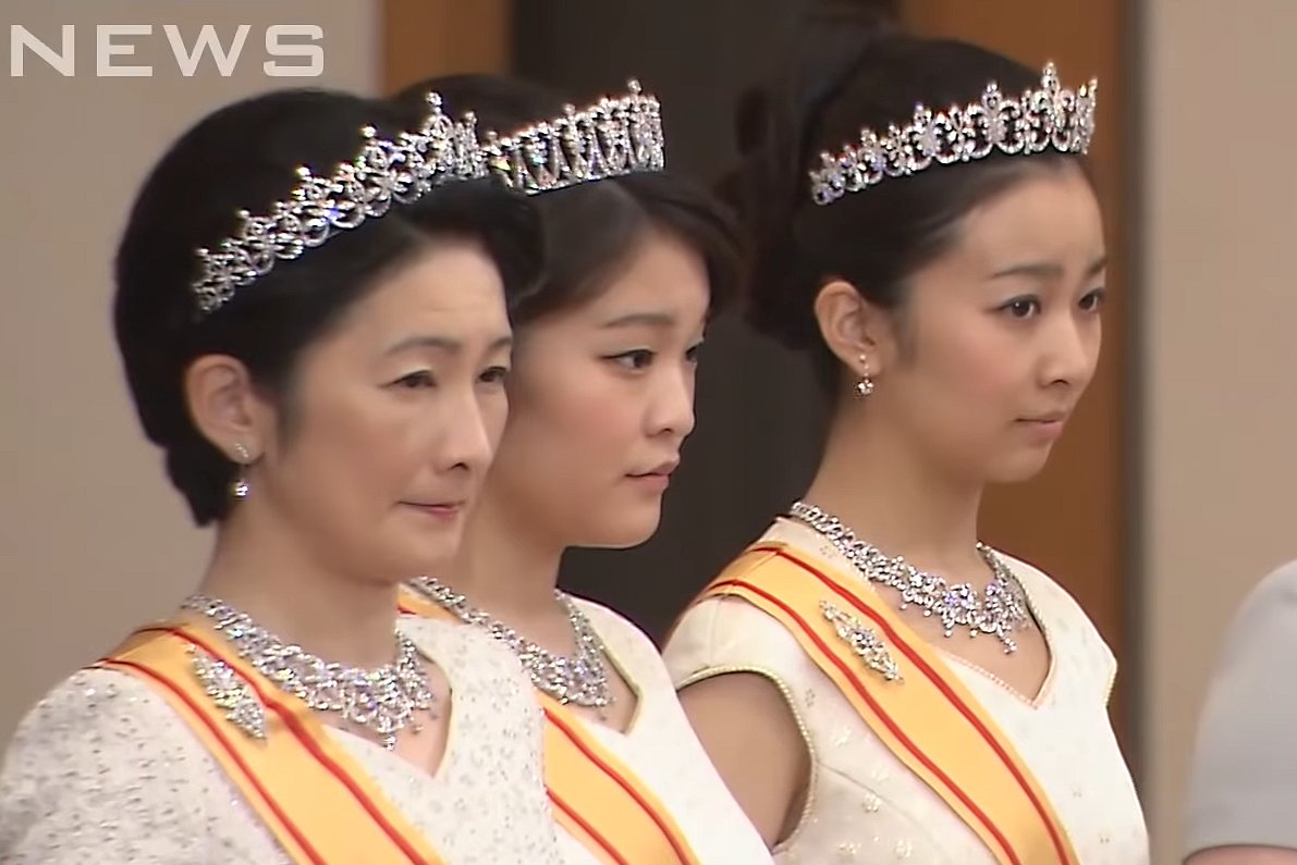 For years, Princess Mako and her diamond parure have been dependable attendants at the annual New Year audience at the Imperial Palace. Above, she’s pictured standing between her mother, the Princess Akishino, and Princess Akiko of Mikasa, in January 2014.