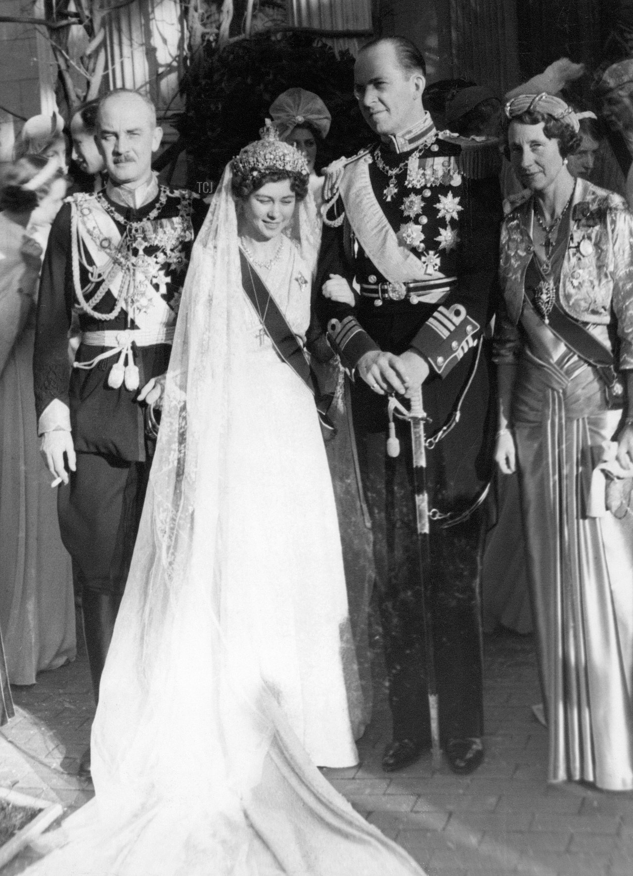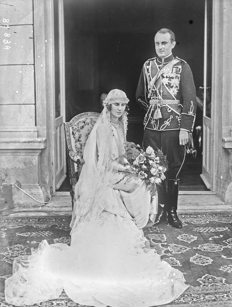 After a failed engagement to King Frederik IX of Denmark (!), Princess Olga of Greece and Denmark (daughter of Prince and Princess Nicholas) married Prince Paul of Yugoslavia in Belgrade in October 1923. The Duke of York—later King George VI of the United Kingdom—was best man at the ceremony. Olga wore a stunning diamond lattice tiara with her bridal veil, plus a classic diamond rivere necklace.