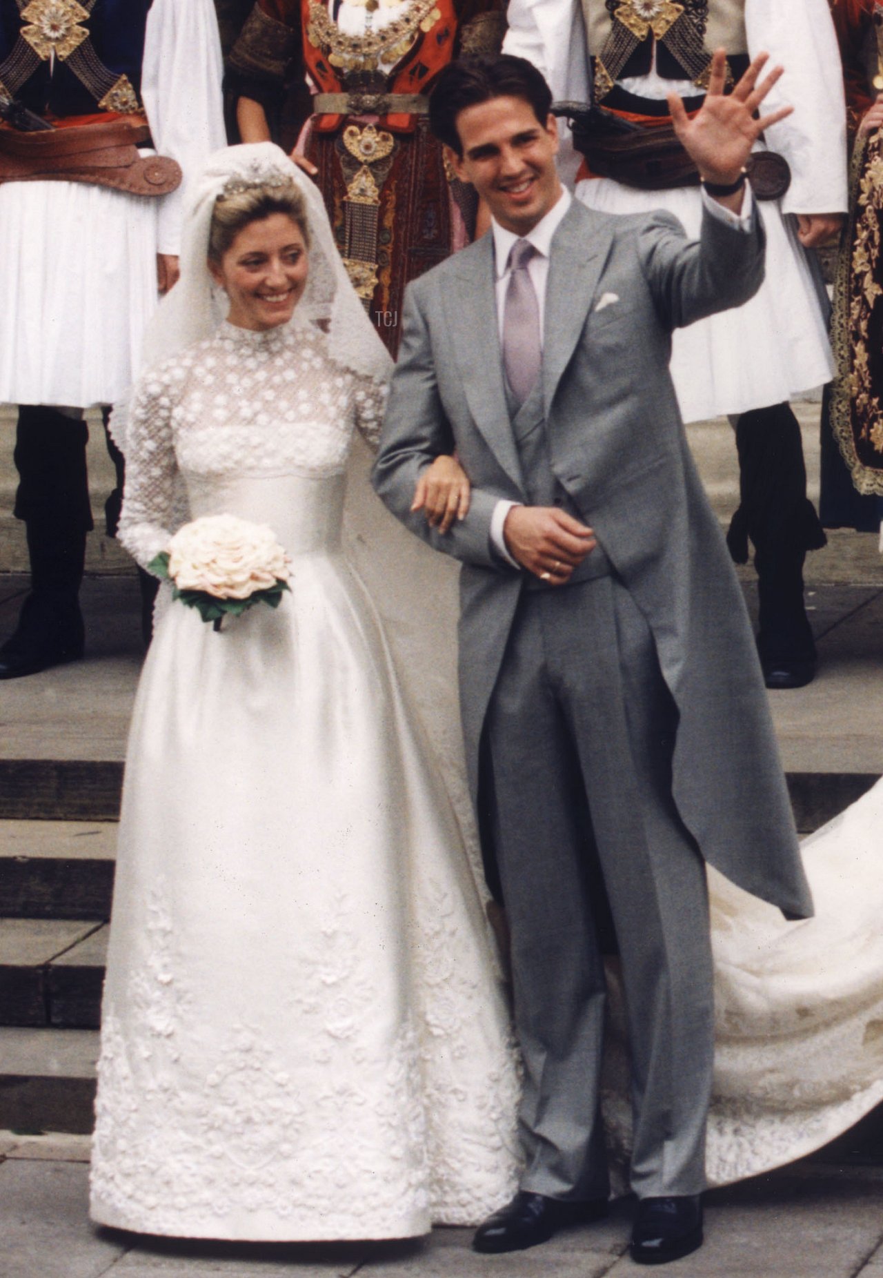 The Greek monarchy was officially abolished by referendum in 1974, after the family had already been living for several years in exile. In July 1995, King Constantine and Queen Anne-Marie’s eldest son, Crown Prince Pavlos, married Marie-Chantal Miller in a Greek Orthodox ceremony at London’s St. Sophia Cathedral. Marie-Chantal borrowed the Antique Corsage Tiara, a Danish royal heirloom, from her mother-in-law for the wedding ceremony. (More on the wedding here!)