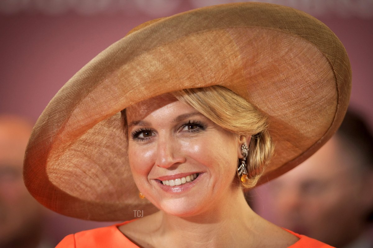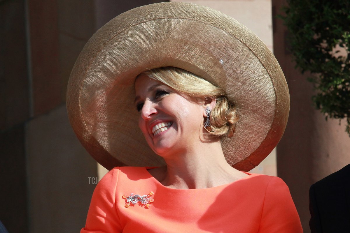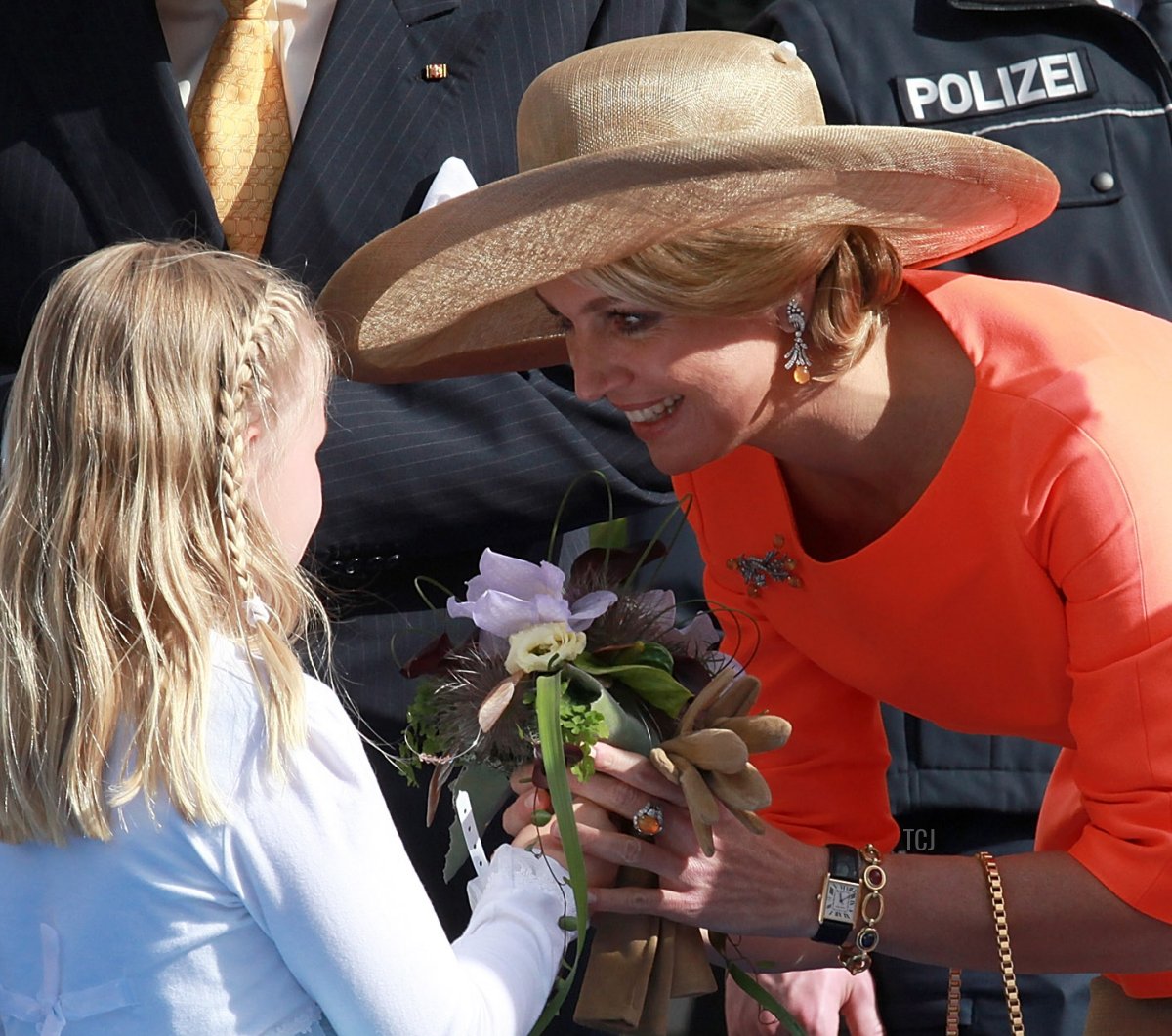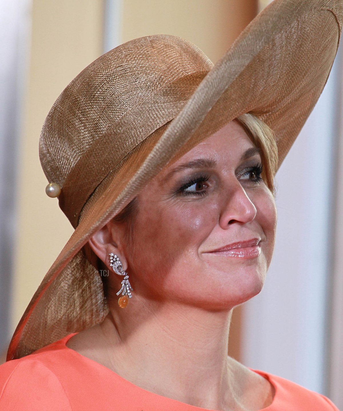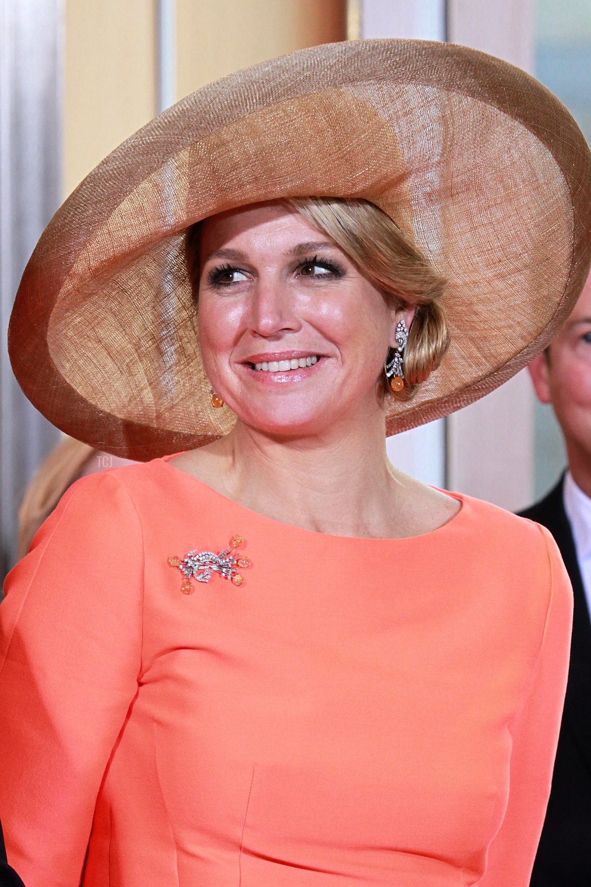 For engagements in Wiesbaden, Queen Maxima wore an exuberant ensemble in shades of orange and tan. (As the name of the Dutch royal dynasty is the House of Orange, the family often plays on the name with the color of their clothes and jewels.)