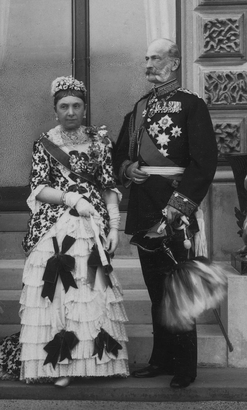 This tiara can be traced back to another European princely family: the Battenbergs. The patriarch of the family was Prince Alexander of Hesse and by Rhine, son of Grand Duke Ludwig II of Hesse (or, depending who you believe, the son of Ludwig’s stablemaster, August von Senarclens de Grancy). In 1841, Prince Alexander’s sister, Princess Marie, married the future Emperor Alexander II of Russia. Prince Alexander accompanied his sister to St. Petersburg, and there, he fell in love with one of her ladies-in-waiting, Countess Julia von Hauke. (Alexander and Julia are pictured together above in 1885.)