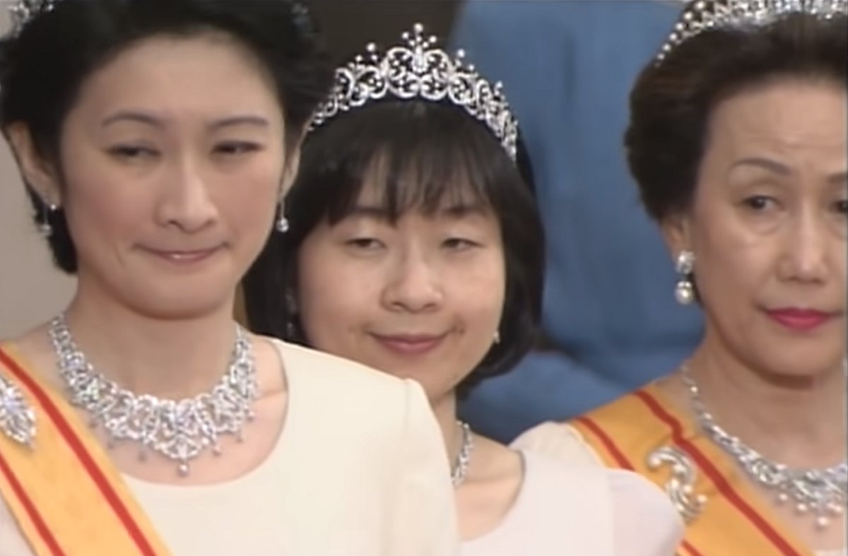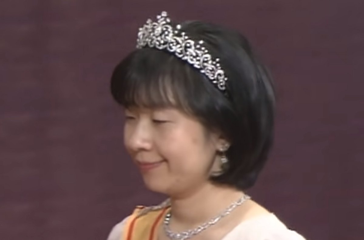 Princess Sayako, pictured here standing between the Princess Akishino and the Princess Hitachi at a court function in 2005, is the only sister of Emperor Naruhito. For fifteen years, Princess Sayako was a working member of the imperial family, and she wore this sparkling diamond tiara for all formal occasions. (She also had a second academic career as an ornithologist.) But in November 2005, when she was 36, the princess married Yoshiki Kuroda, an urban planner working for the city of Tokyo. On her marriage, she lost her imperial status and became Sayako Kuroda. Today, she is the Supreme Priestess at the Ise Grand Shrine.