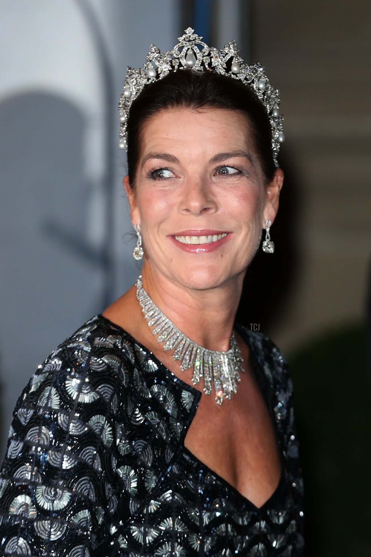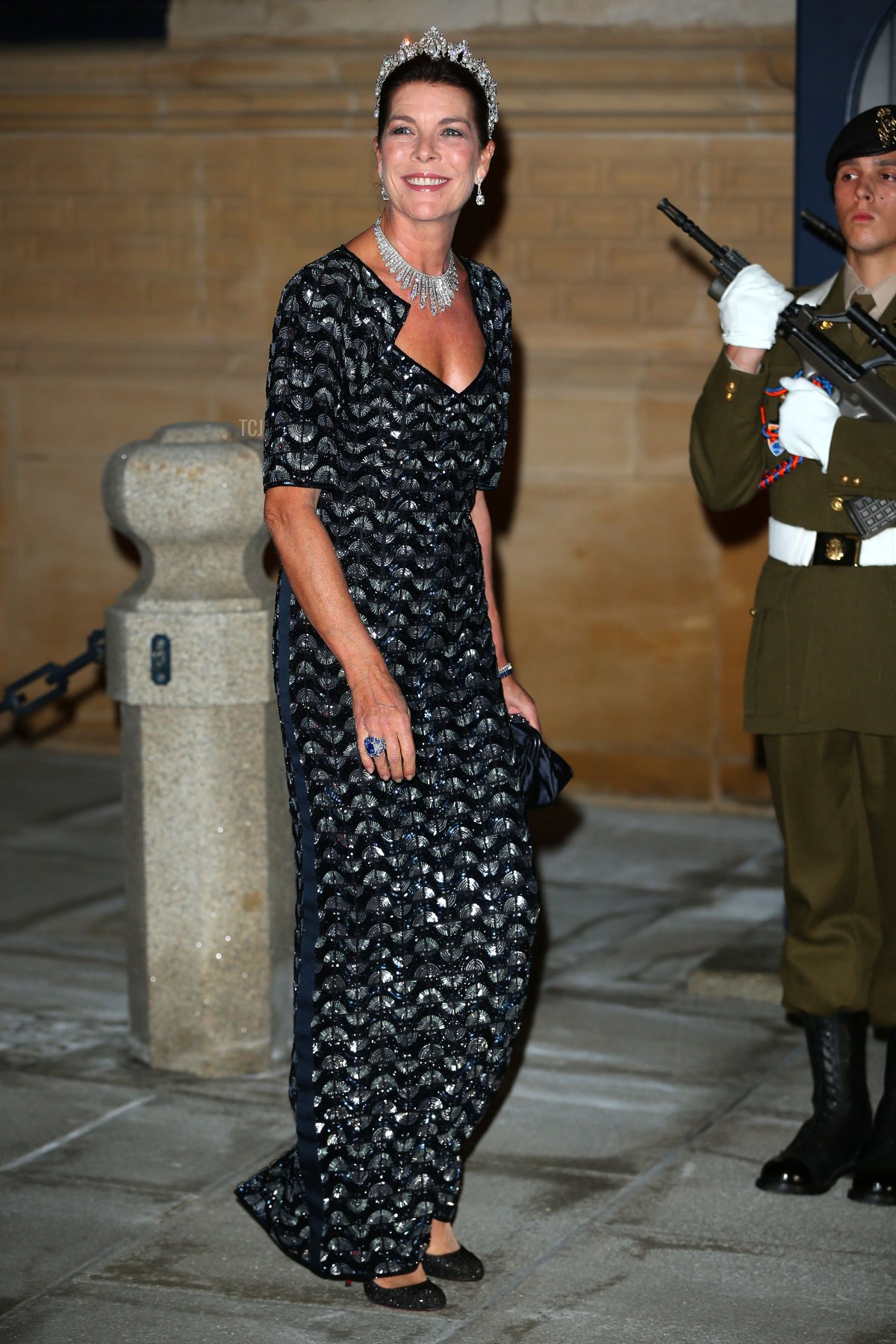 In October 2012, Princess Caroline traveled to Luxembourg to be part of the wedding celebrations for Hereditary Grand Duke Guillaume and Hereditary Grand Duchess Stephanie. She wore a chic evening gown spangled with silver and blue beading for the dinner held the night before the royal wedding.