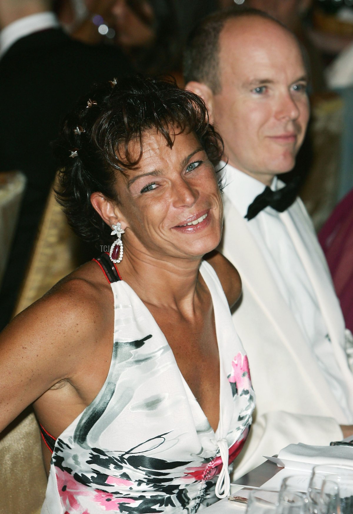 Princess Stephanie wore a white gown with a bold floral print for the ball. Over the years, Princess Stephanie has been a less enthusiastic jewelry-wearer than her older sister. But for this Red Cross Ball, both women wore treasured rubies from their late mother’s collection.