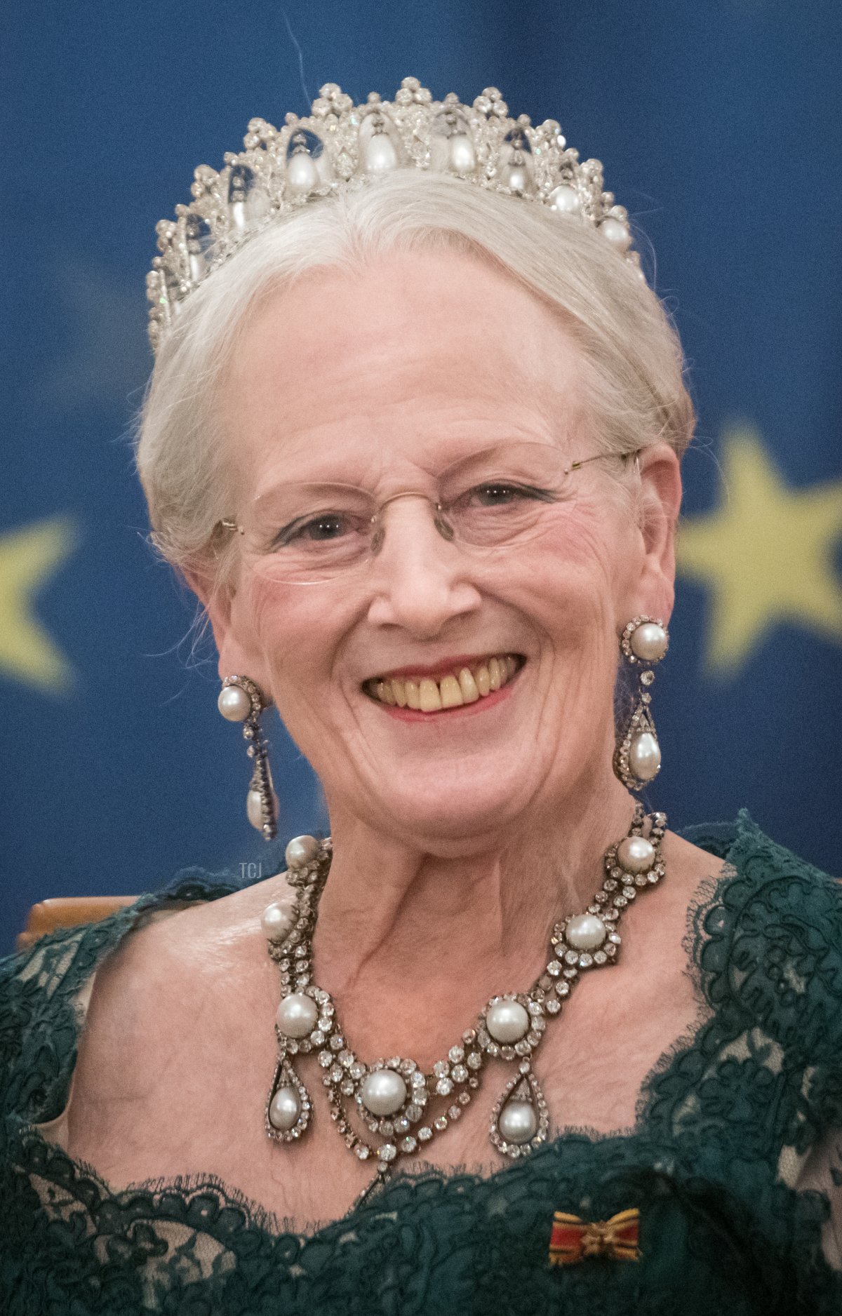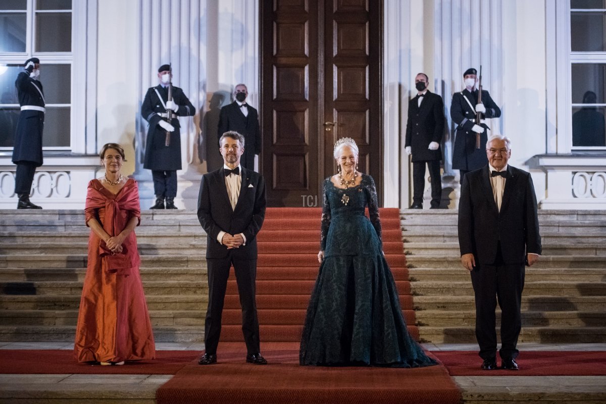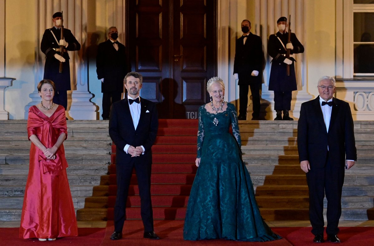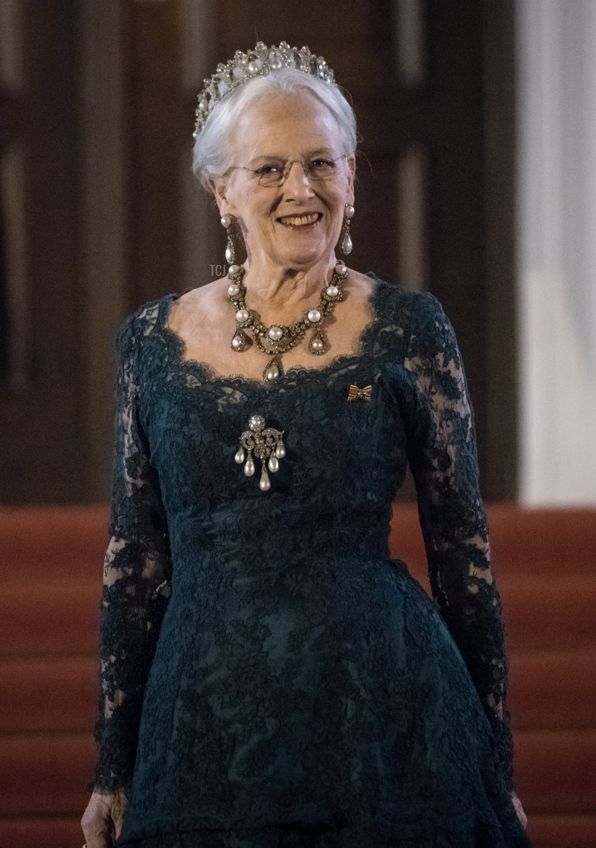 Queen Margrethe wore an evening gown made of dark teal-green lace for the banquet, and she accessorized with important diamond and pearl jewels. You’ll also spot the miniature ribbon of her German order, the Order of Merit of the Federal Republic of Germany, pinned to her dress.
