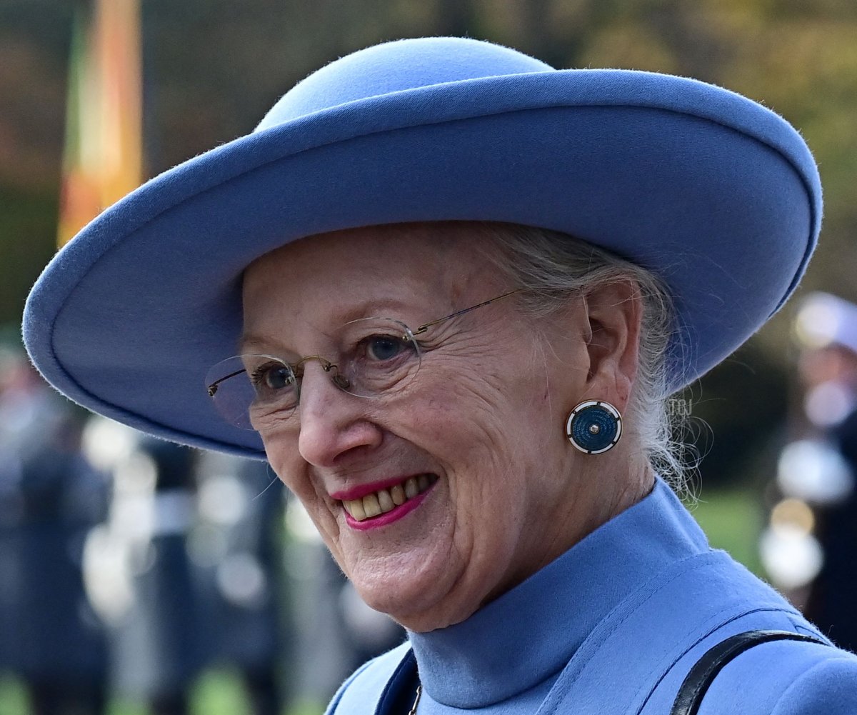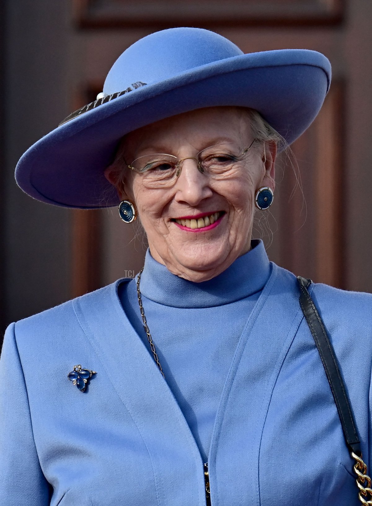 Queen Margrethe chose blue, one of her favorite colors, for her arrival ensemble. She added even more blue with an array of jewels in various shades of the same color.