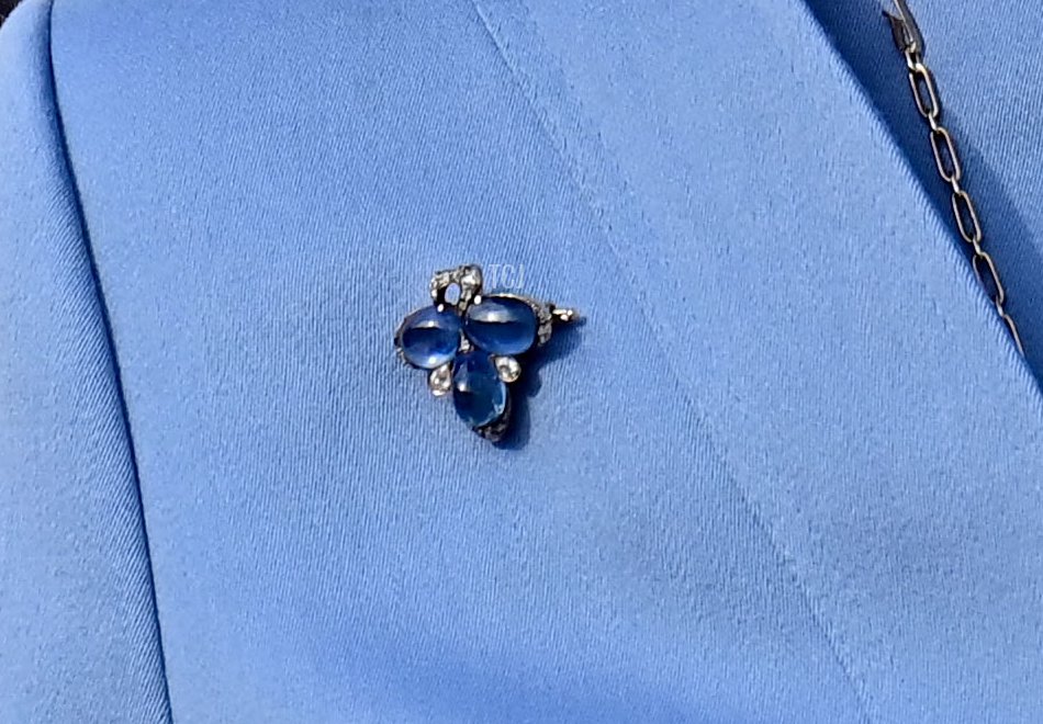 She pinned a lovely little trefoil brooch to her jacket. The jewel is set with sapphire cabochons and small diamonds.