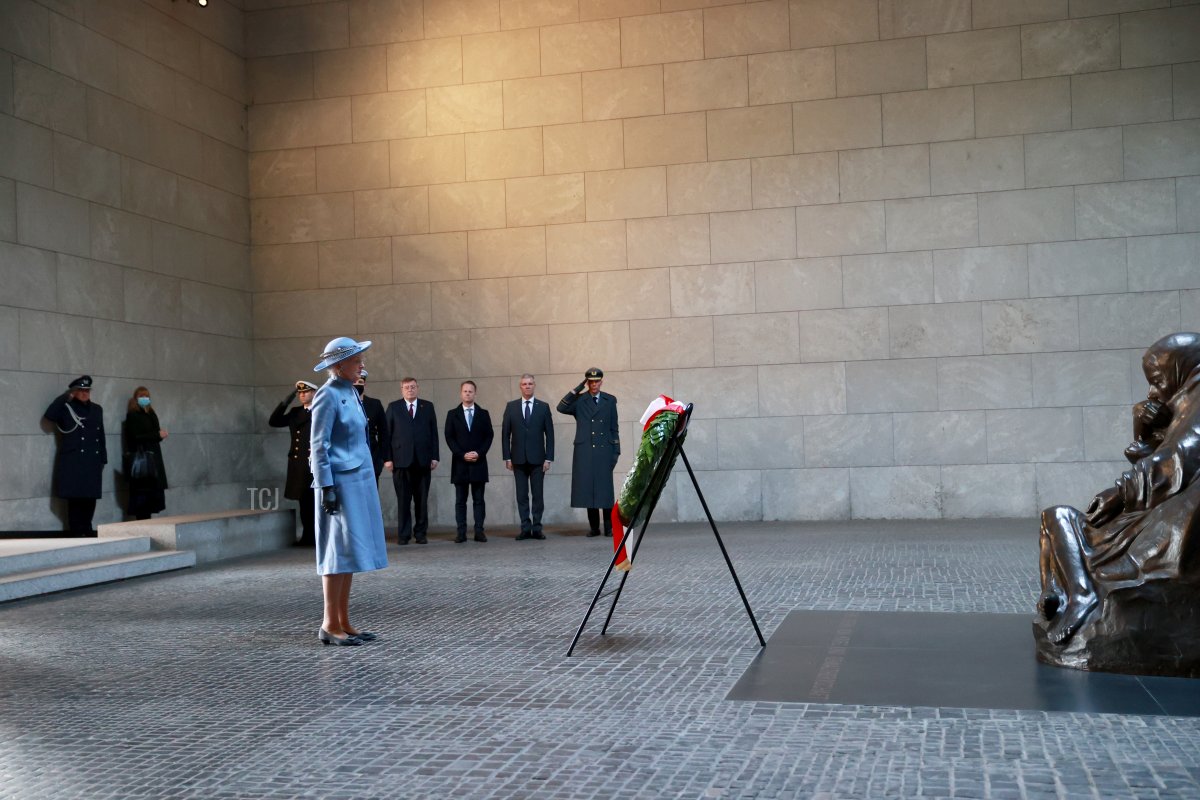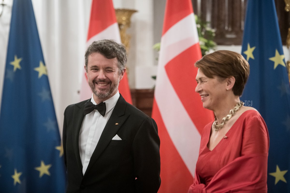 And the Queen and the Crown Prince posed for a photograph together in front of Berlin’s iconic Brandenburg Gate. Margrethe added a white coat to her outfit as the day transitioned to evening.