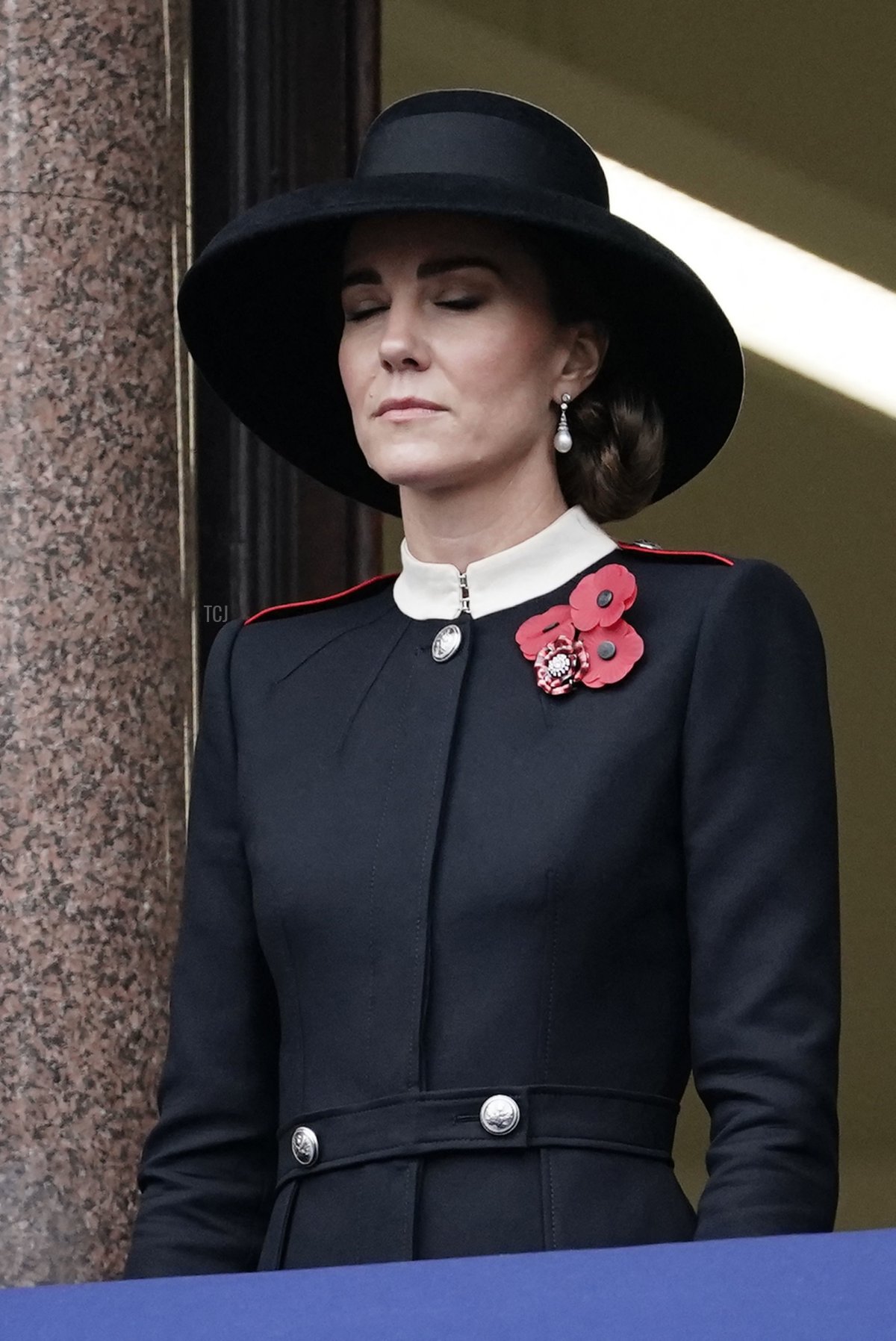 The Duchess of Cambridge wore the Collingwood Pearl Earrings, a legacy from Diana, Princess of Wales, for the service. She also wore the earrings for the Festival of Remembrance the night before. With her paper poppies, she wore a crystal poppy pin, part of a range sold by the Royal British Legion (the same organization that produces and sells the paper poppies).