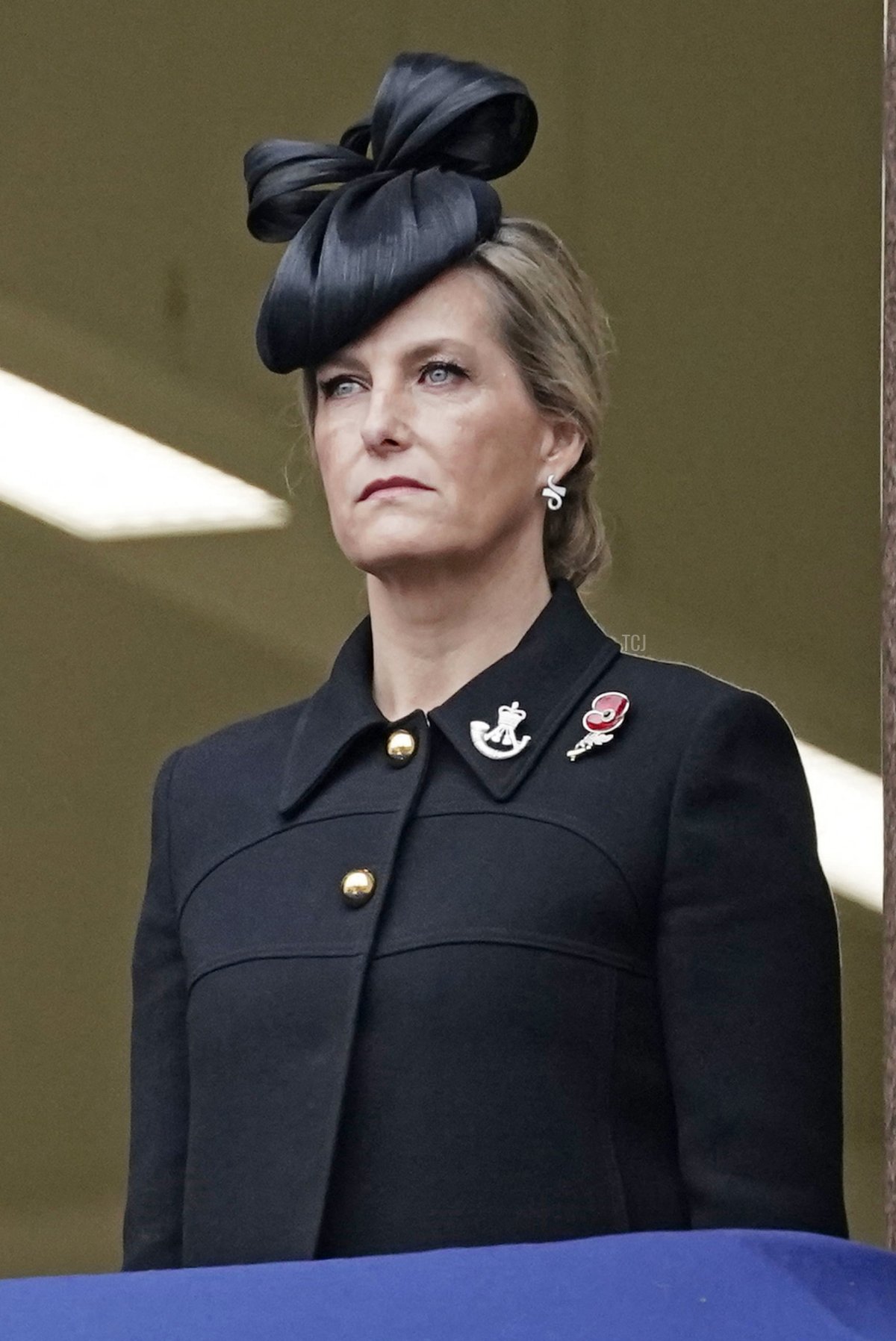 The Countess of Wessex wore a pair of modern scroll earrings on the balcony, as well as a pair of pins. Like Kate, she wore a crystal poppy pin from the RBL. On her collar, she pinned the cap badge of The Rifles. Sophie is the Royal Colonel of the regiment’s 5th Battalion.