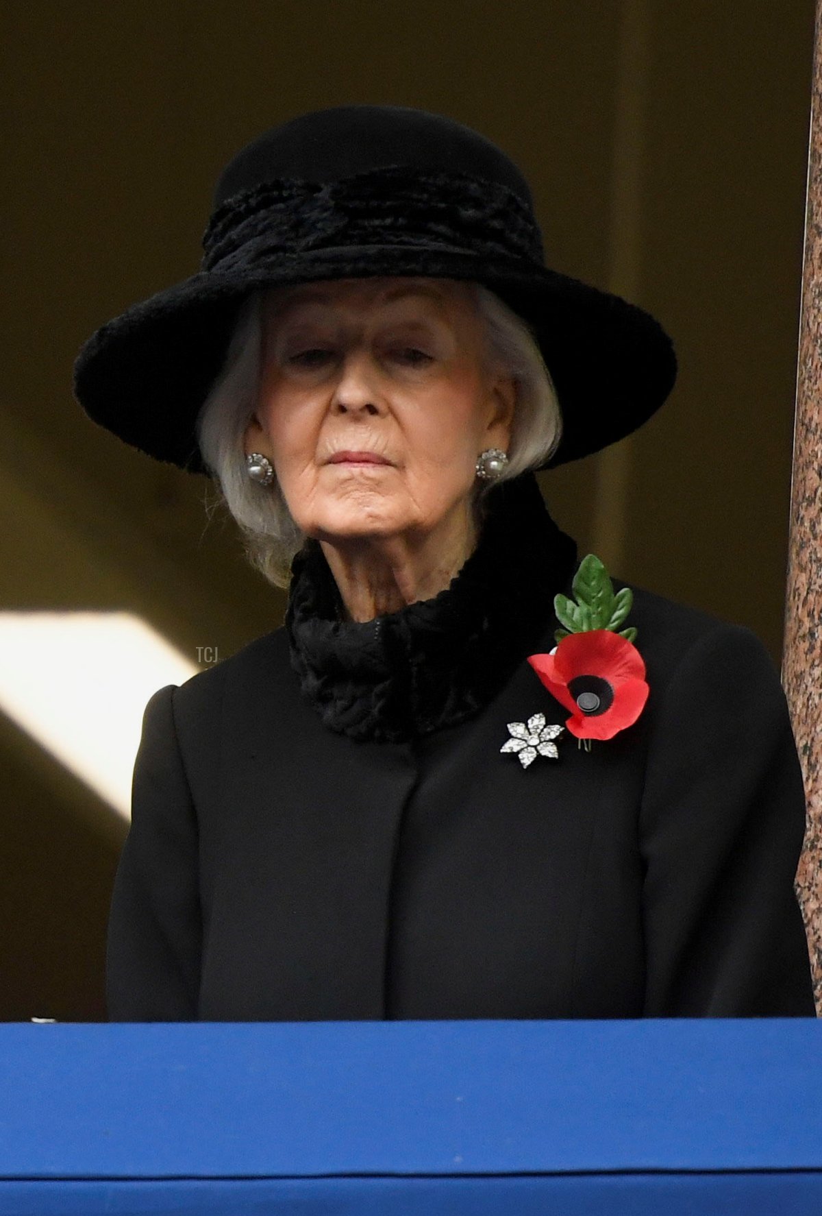 Princess Alexandra also joined her brother, the Duke of Kent, on a balcony to watch the service. She wore a large paper poppy, anchored by her diamond clematis brooch. She completed her ensemble with her classic diamond and pearl cluster earrings. She wore both the brooch and the earrings the previous evening for the Festival of Remembrance as well.