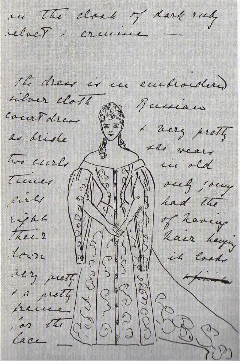 All Romanov imperial brides wore dresses made of cloth of silver or gold, with jeweled buttons down the skirt, topped by a velvet and ermine mantle. Their diamond accessories included the grand tiara made for Empress Elizabeth, which featured the Paul I Pink Diamond, as well as the Nuptial Crown, the Cherry Earrings, the Diamond Necklace, the Diamond Bracelet, and the Cloak Clasp, which had been made for Catherine the Great. Here, Ella sketches Alix’s wedding dress without the jewels and the velvet cloak. In the letter, she discusses the lace veil worn by Alix as her bridal veil. It was the same lace wedding veil that had been worn by her mother, Princess Alice of the United Kingdom, and her sisters, Princess Victoria, Grand Duchess Ella, and Princess Irene.