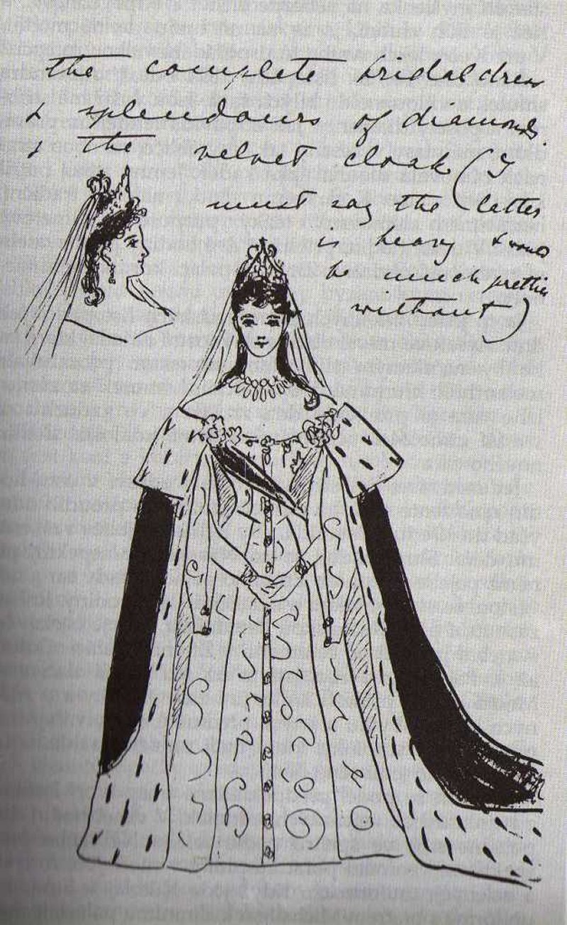 No photographs seem to have been taken of Alexandra Feodorovna in her wedding gown, perhaps because of the odd and unusual atmosphere surrounding a grand wedding in the midst of a funereal time. We have to be satisfied with descriptions, sketches, and paintings of the wedding instead. The elderly Queen Victoria couldn’t make the trip to Russia, so Grand Duchess Ella obligingly wrote her grandmother a letter containing a description and sketches of Alix’s wedding clothes and jewels. Ella knew the ensemble well: the bridal attire of the Romanovs was standard, dictated by imperial code, and Ella had essentially worn the very same thing for her own wedding.