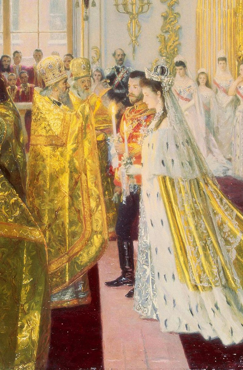 The report continued, “Then the Metropolitan took two crowns, and placing the first one upon the head of the Czar, said: ‘The servant of God, Nicholas, is crowned for the handmaid of God, Alix, in the name of the Father, and of the Son, and of the Holy Ghost.’ Placing the other crown upon the head of the bride, he said: ‘The handmaid of God, Alix, is crowned for the servant of God, Nicholas, in the name of the Father, and of the Son, and of the Holy Ghost.’ The prelate then blessed the couple thrice, saying, ‘O Lord, our God, crown them with glory and honour.’ After anthems and prayers, the ‘common cup’ was brought and blessed. The cup was filled and handed first to the Czar and then to the Princess, each taking a sip of the wine. The Metropolitan then took the couple by the hand, the groomsman and bridesmaid walking behind and holding the crowns over their heads, and led them three times around the dais, the choir meanwhile singing a troparion. The rings were exchanged for the third and last time. The priest then offered up a prayer, after which he pronounced the blessing.”